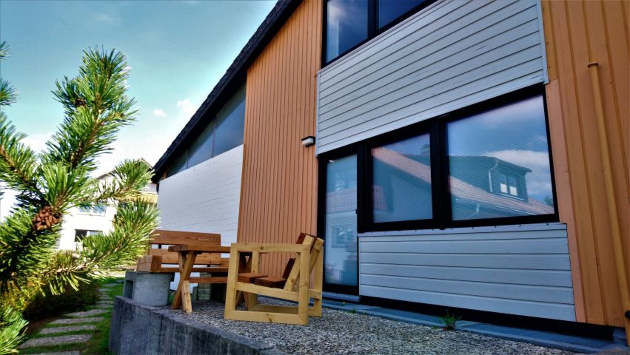 Durch die großen Panoramafenster wirkt die Unterkunft offen, freundlich und hell.