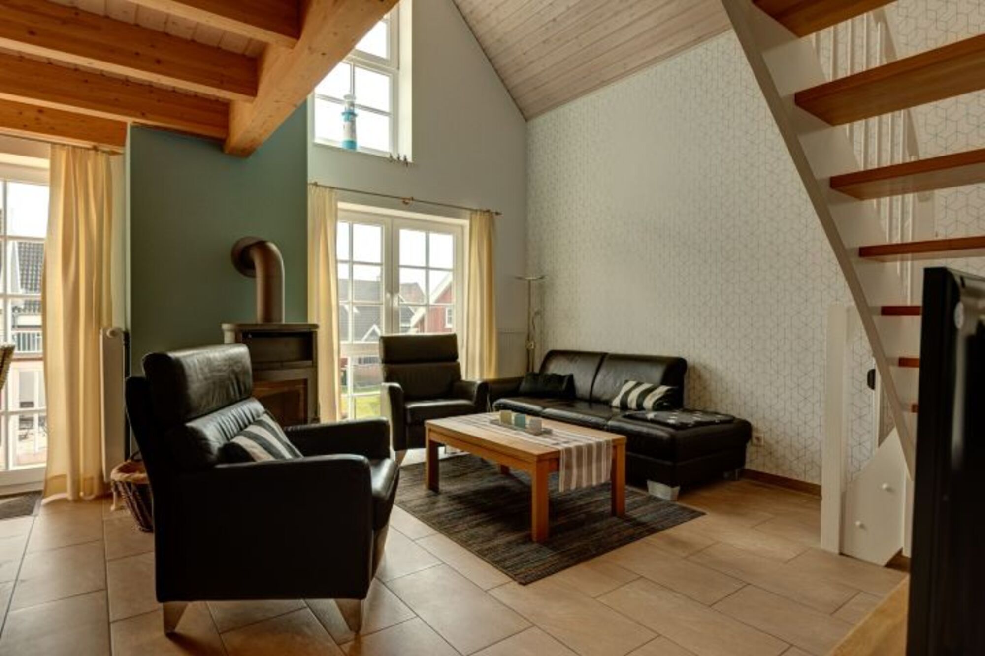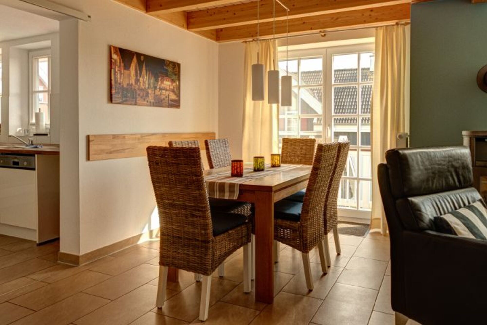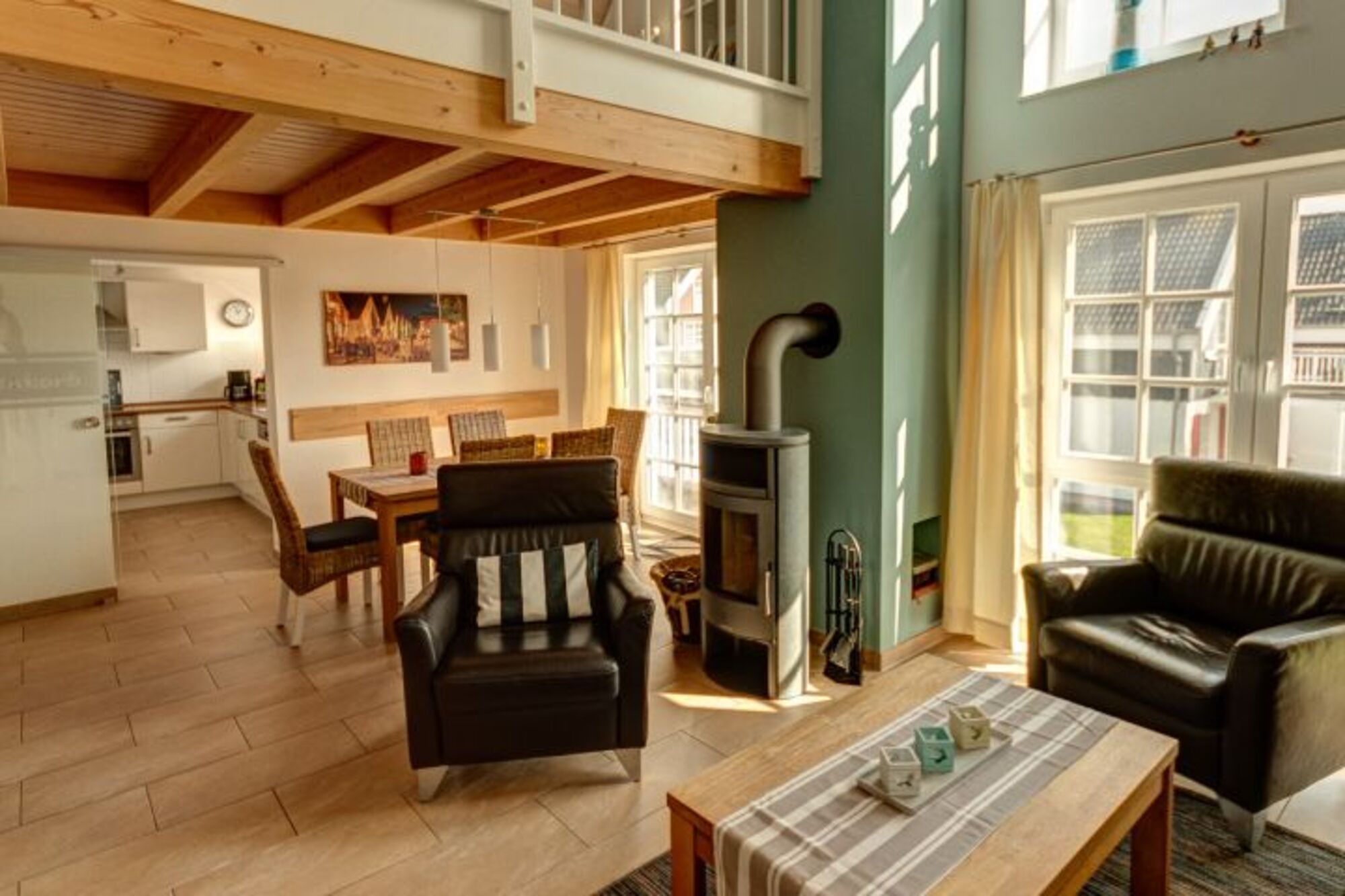 Eine bequeme Ledergarnitur und ein Kaminofen im Wohnbereich, ein schöner Essbereich und der großzügige Balkon sind bei jeder Wetterlage ideal für einen kleinen Plausch bei einer Tasse Ostfriesentee.