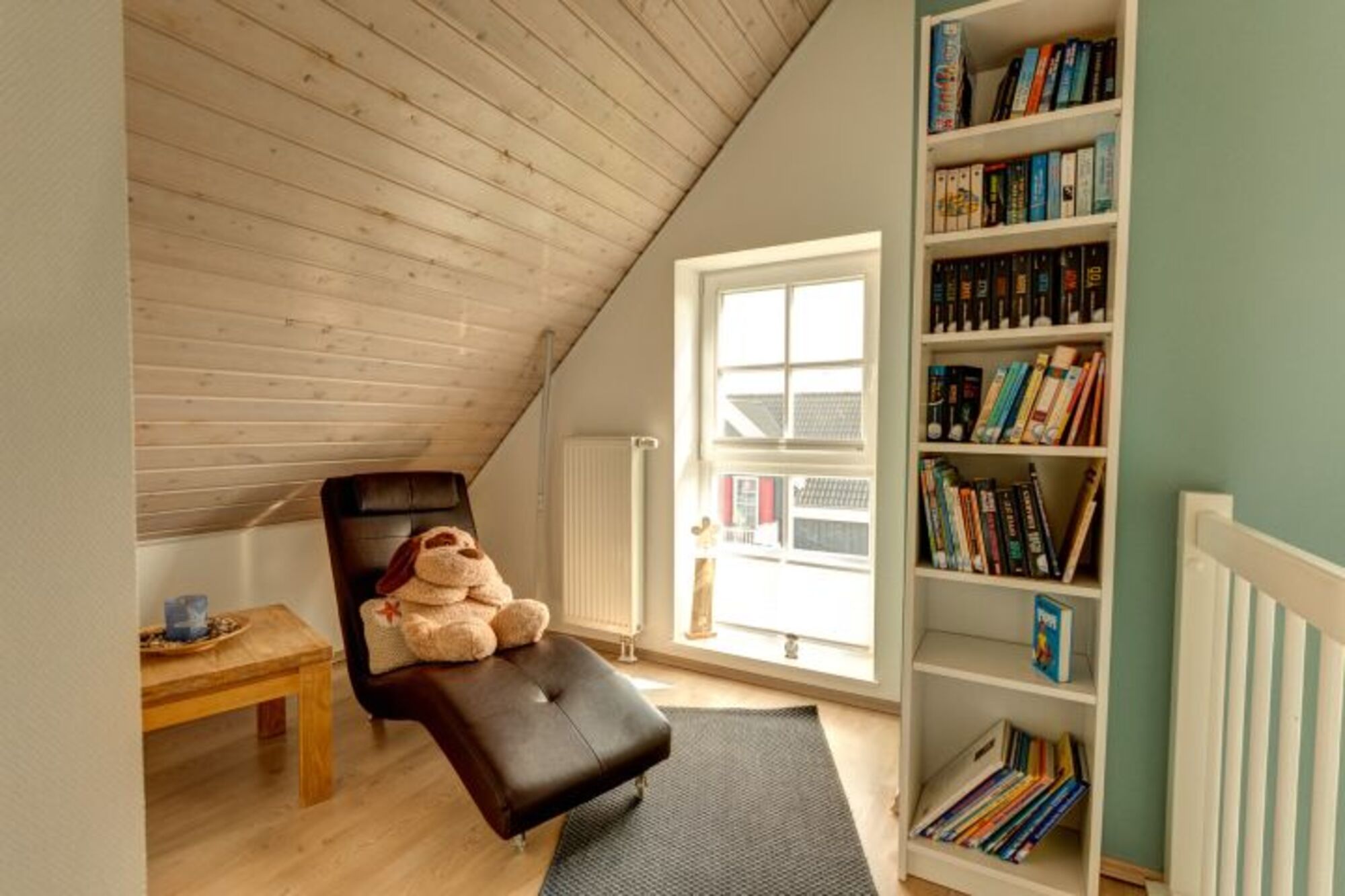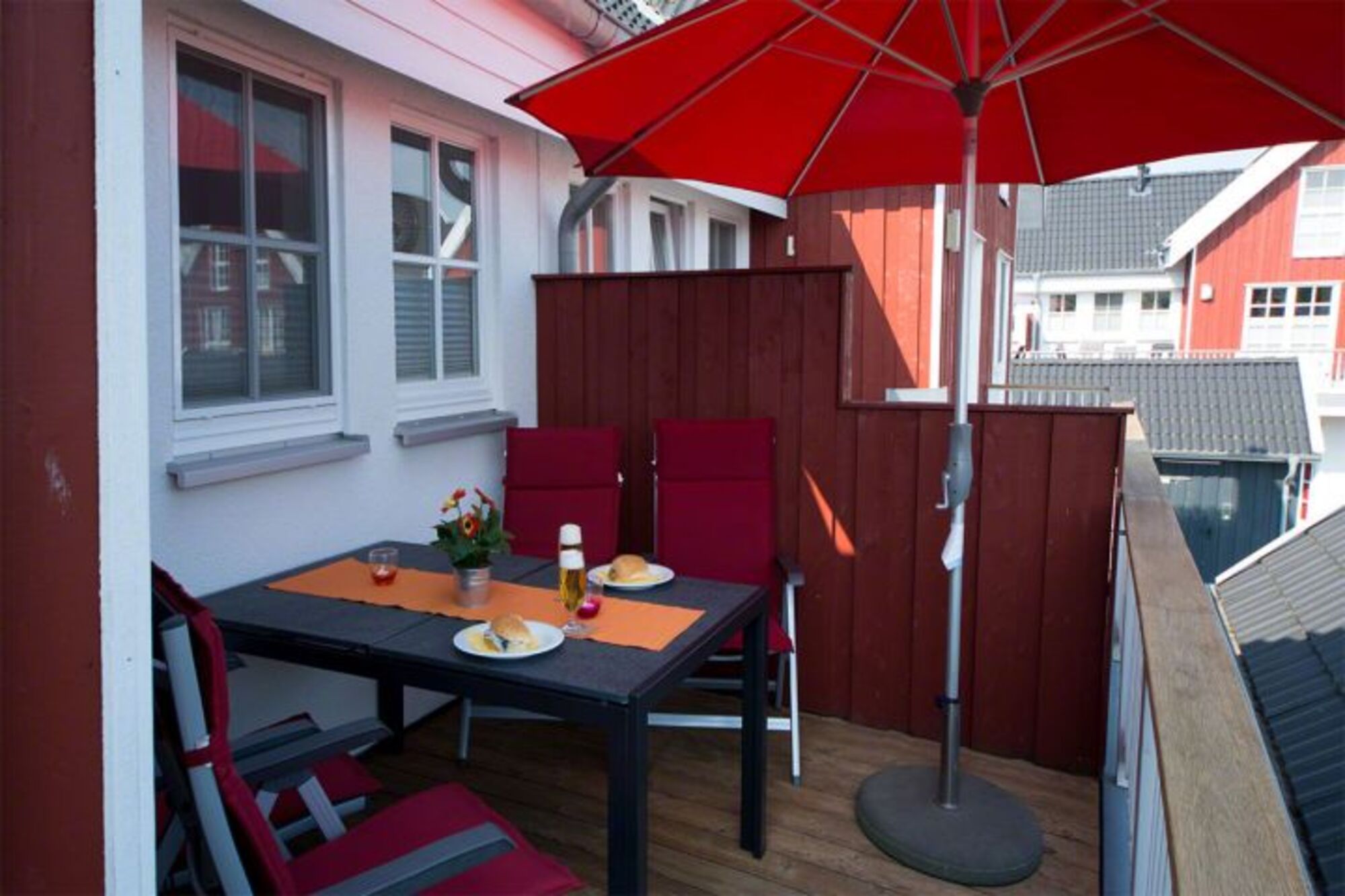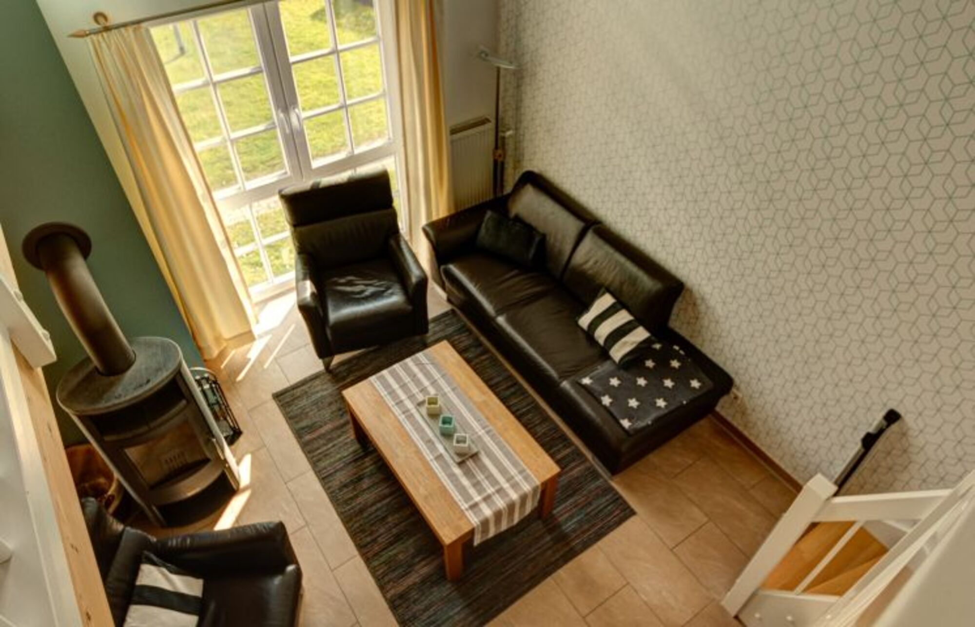 Eine bequeme Ledergarnitur und ein Kaminofen im Wohnbereich, ein schöner Essbereich und der großzügige Balkon sind bei jeder Wetterlage ideal für einen kleinen Plausch bei einer Tasse Ostfriesentee.