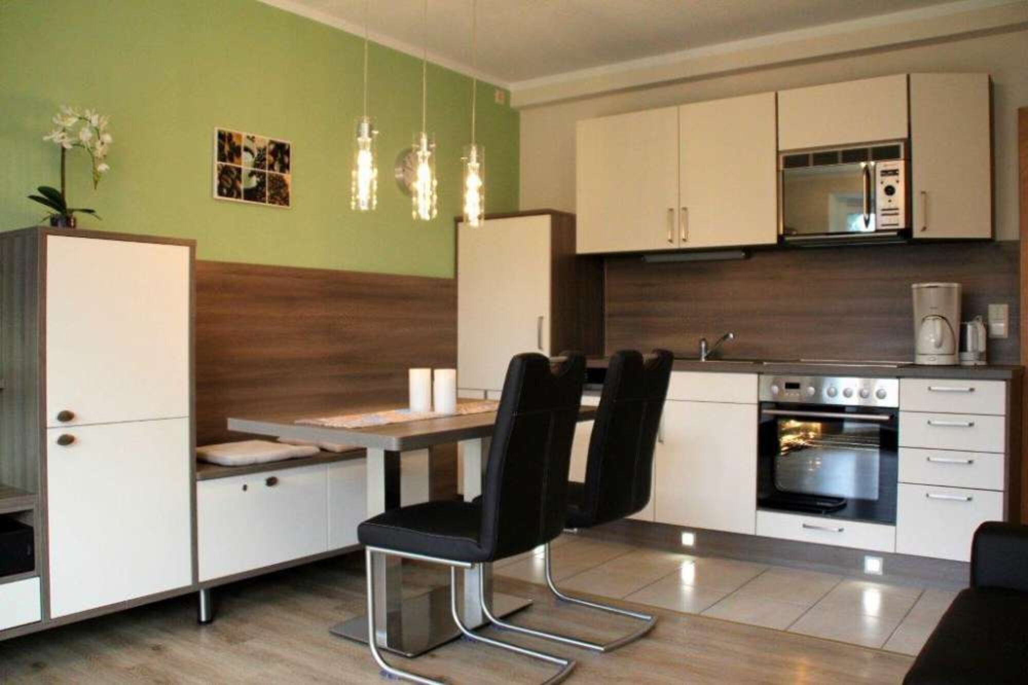 Ihr Mahl genießen können Sie am großen Esstisch mit vier Stühlen, direkt angrenzend zur Küchenzeile und Wohnbereich.