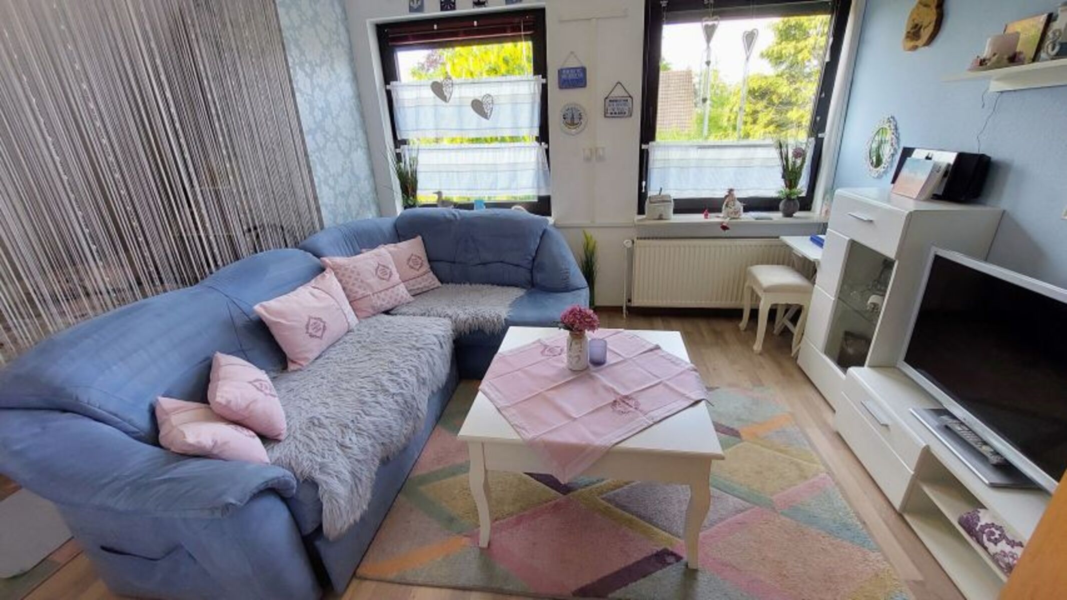 Der Wohnbereich mit gemütlichem Eck- Sofa ist in schönen Blau Tönen gehalten und optisch vom Schlafbereich getrennt. Vom angrenzenden Flur kommen Sie in die Küche und auf den überdachten Balkon, auf dem geraucht werden kann. Ansonsten ist das gesamte Haus ein Nichtraucher Haus. Der Wohnbereich hat einen SAT-TV sowie eine Musikanlage, sowie elektrische Rolladen. Unsere Vitrine ist gut bestückt mit Gläser für jeden Anlass. Der Boden ist Laminat.Der Schlafbereich hat 2 Betten mit den Bettmaßen 1, 40 x 1, 90 sowie 1,00 x 2,00. Ein großer Kleiderschrank befindet sich im Flur.
