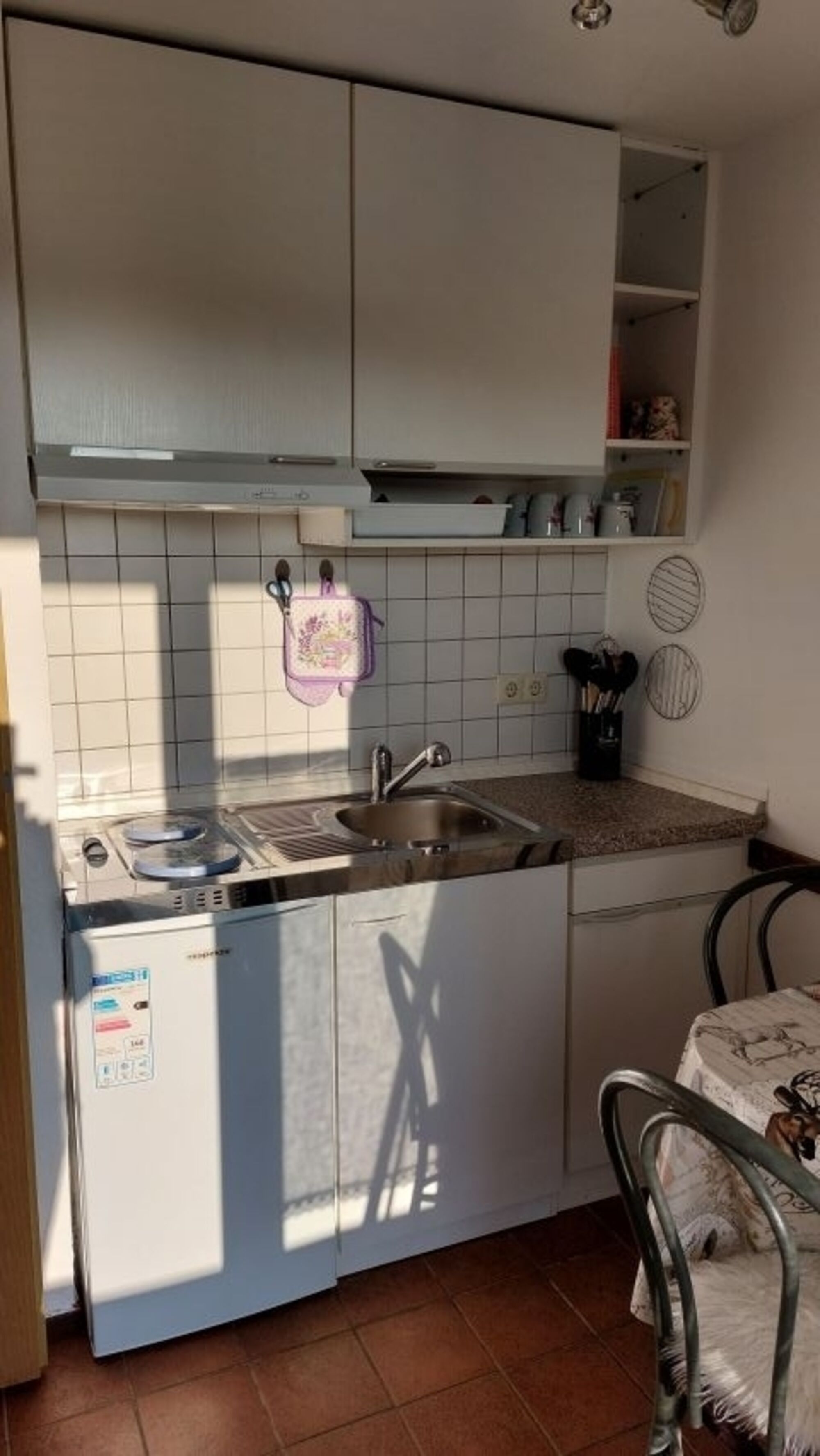 Die Küchenzeile ist ausgestattet mit einem 2-Platten Herd, Mini Backofen, Kühlschrank mit 3***Fach, Kaffeemaschine, Wasserkocher, Toaster und Teflon Kochtöpfen. Der Esstisch ist in der Küche und für 2-3 Personen ausgelegt.