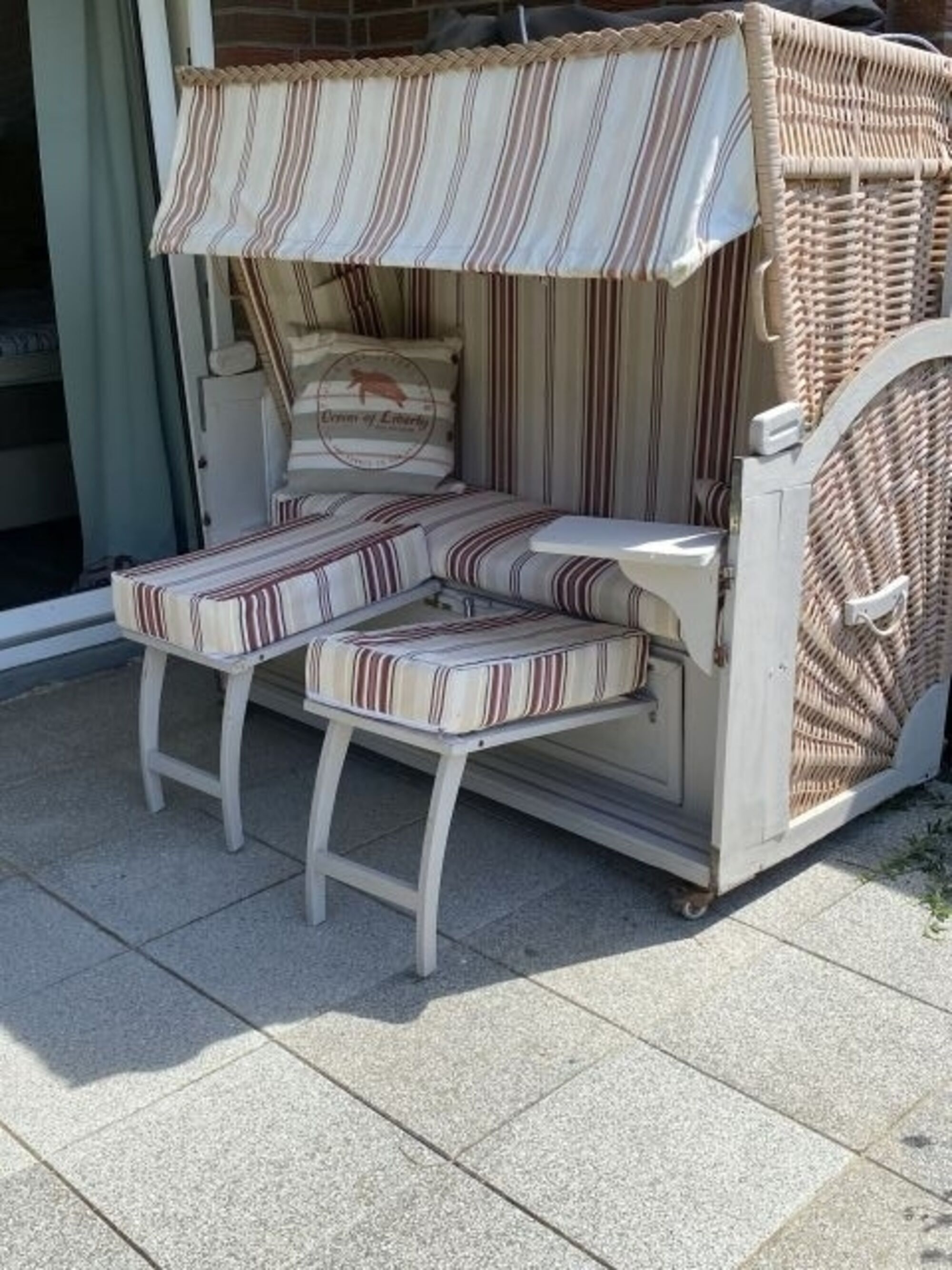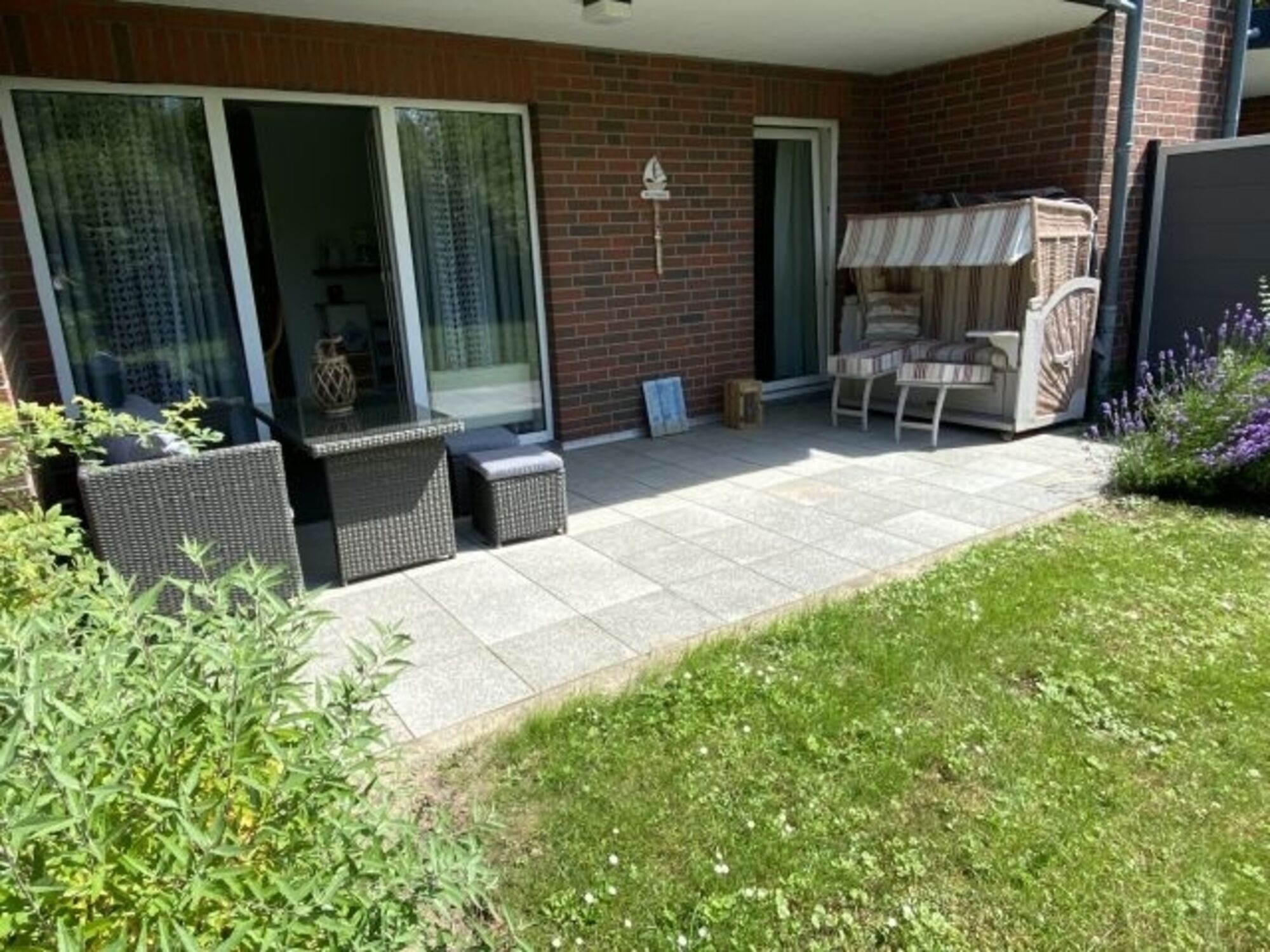 Vom Wohn- und Schlafzimmer gelangen Sie auf die Terrasse. Dort steht unseren Gästen ein gemütlicher XL-Strandkorb und eine Rattansitzgruppe zur Verfügung.