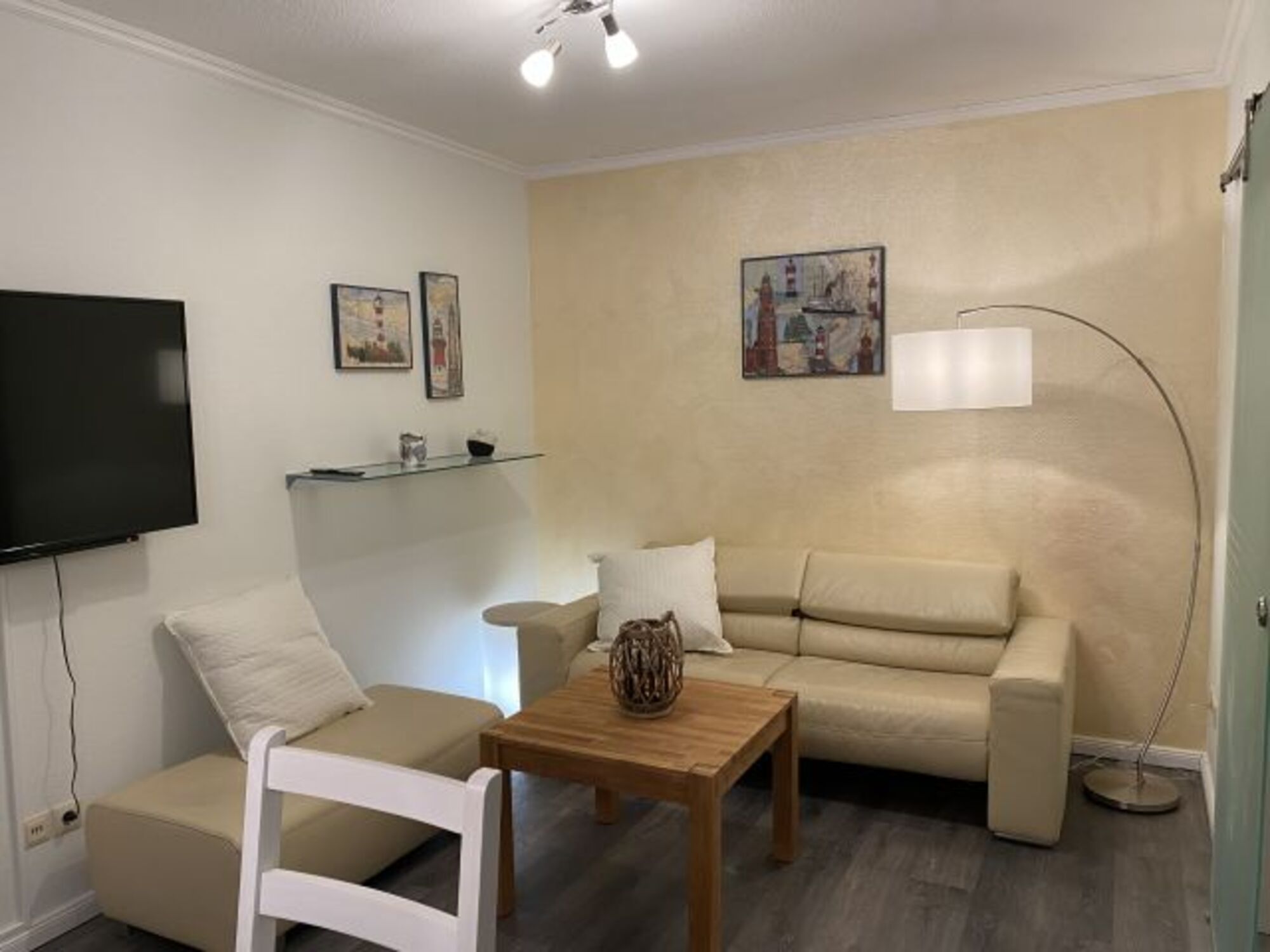 Zur Wohnung gehört eine ca. 20 qm große, überdachte Terrasse, mit Blick ins Grüne. Im zum Küchenbereich offen gehaltenen Wohn-/Essbereich sorgen bewusst eingesetzte Farbgebungen für eine gute Stimmung. Eine gemütliche Ledergarnitur, Smart-TV, indirekte Beleuchtung und eine Glasschiebetür sorgen optisch für Weite.