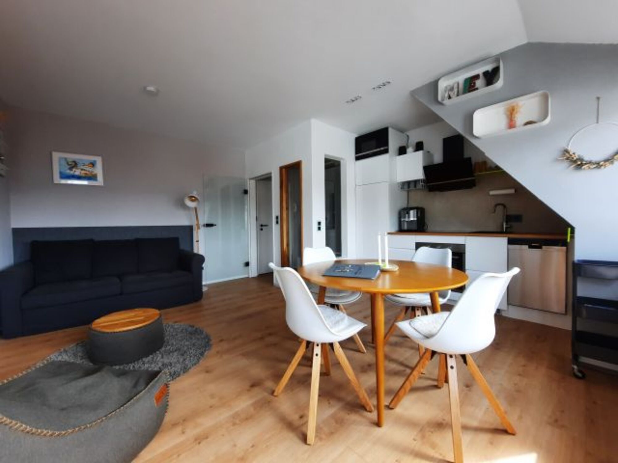 Wohnzimmer mit integrierter Küchenzeile und weiterer Schlafmöglichkeit für zwei Personen auf einem ausziehbaren Schlafsofa (Liegefläche 1,40x2,00m). Zusätzlich Sitzsack (SACKit).