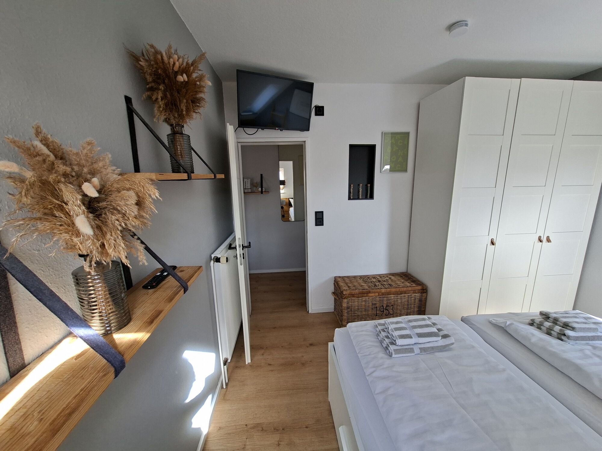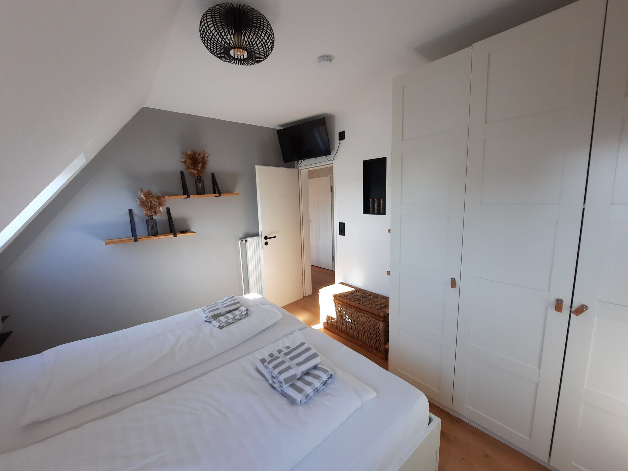 Schlafzimmer mit Doppelbett (1,80x2,00m) mit einem geräumigen Kleiderschrank sowie Smart-TV (Position einstellbar).