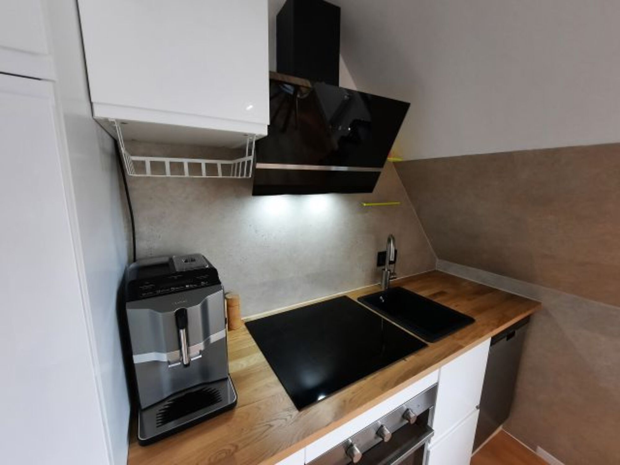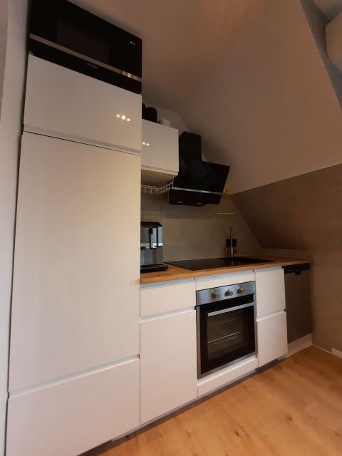 Küche mit Kühlschrank mit Gefrierfach, Wasserkocher, Mikrowelle mit Grillfunktion, elektrischer Stabmixer, Toaster, Kaffeevollautomat, Backofen, Induktionskochfeld, Spülmaschine etc. ausgestattet. Geräte überwiegend von Siemens.