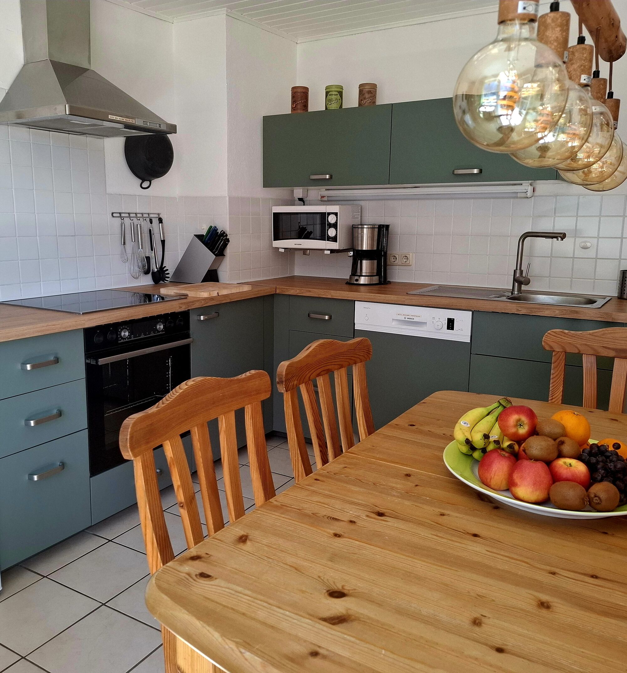 Die voll ausgestattete und moderne Küche mit großem Essbereich lädt zu geselligen Kocherlebnissen ein und lässt keine Wünsche offen.