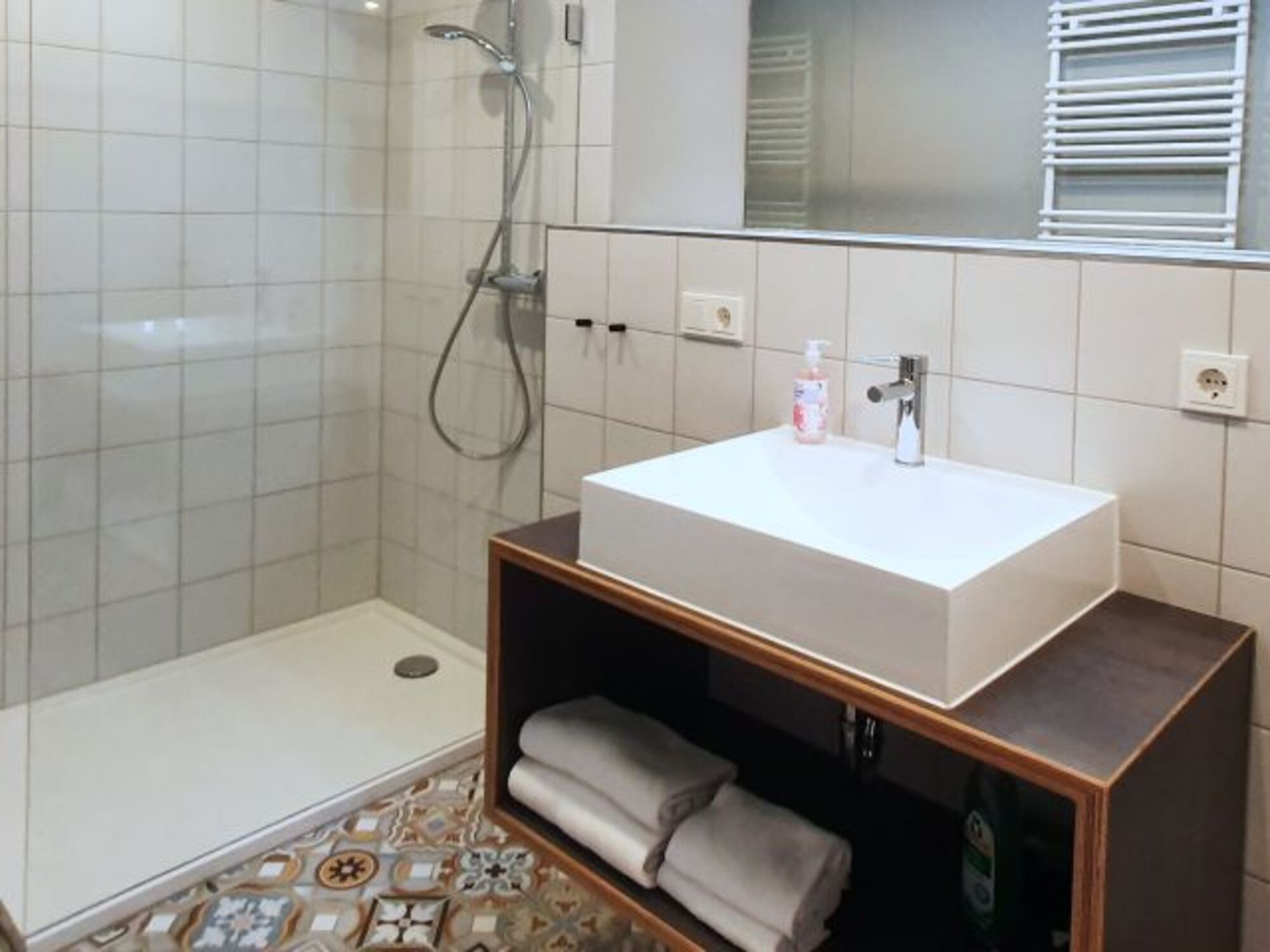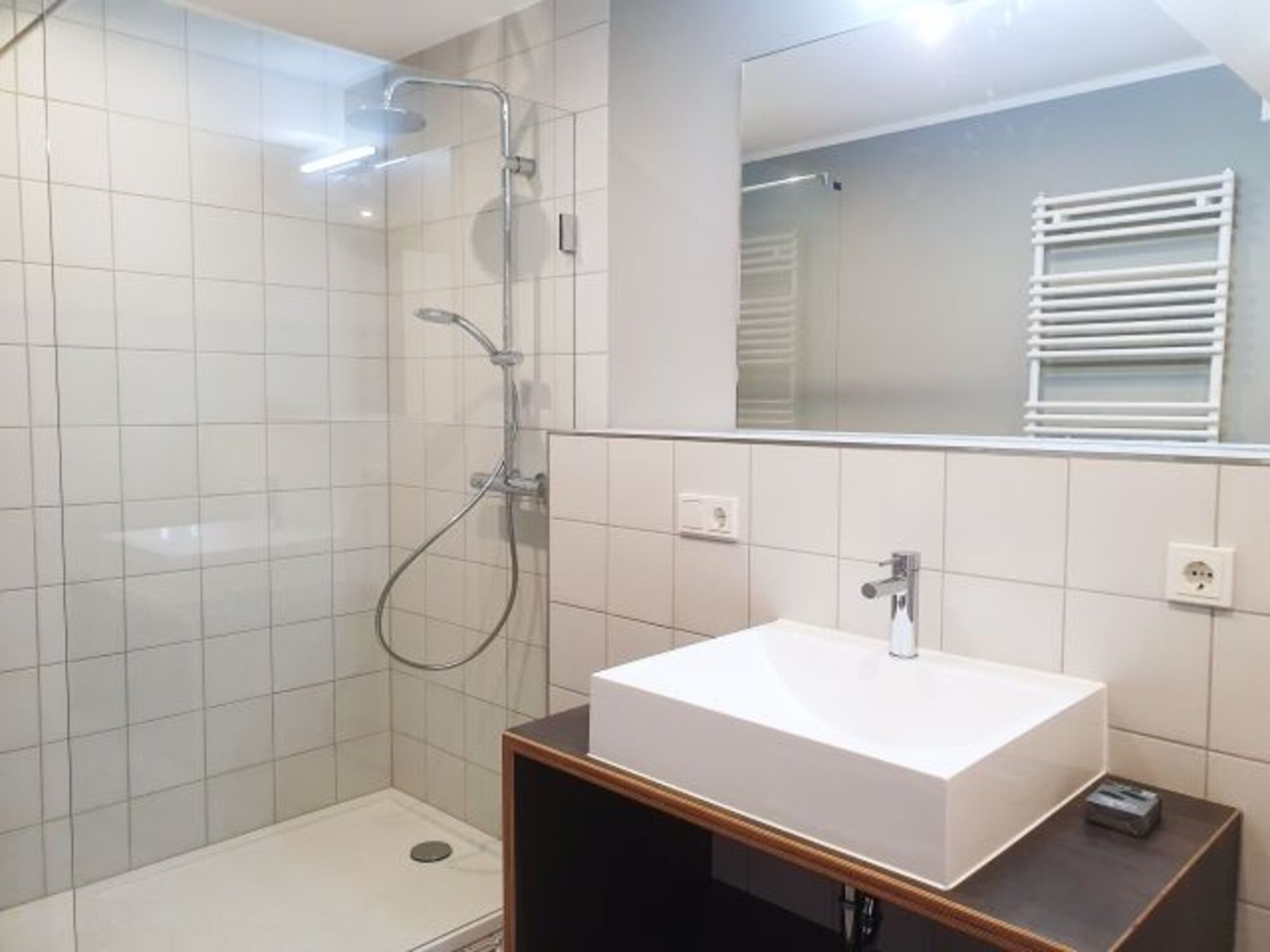 Modernes Bad mit großer Luxus-Glasdusche, WC, schönem Waschtisch und Fön. Internet über W-Lan wird gestellt.