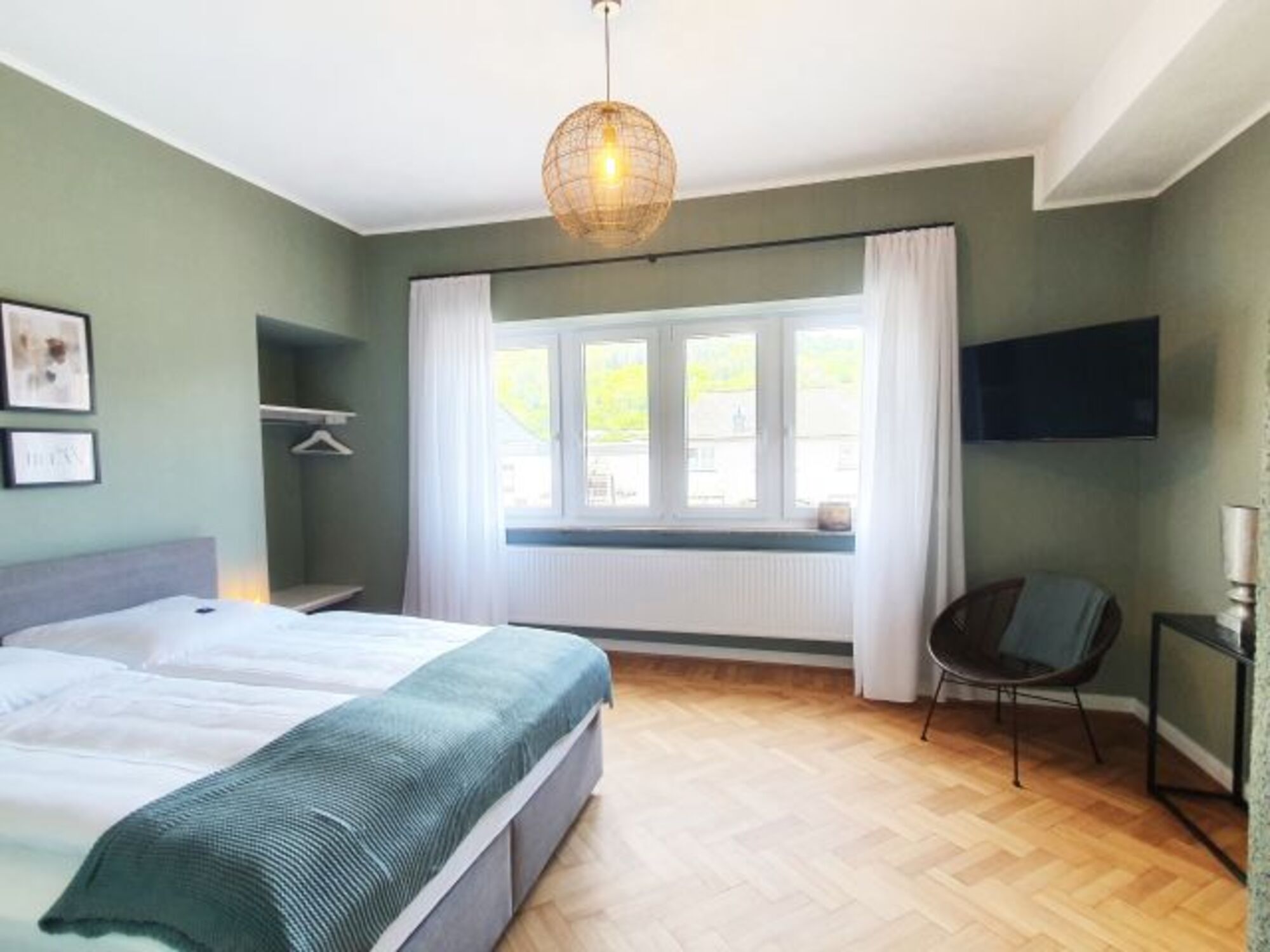 Moderner Schlafraum mit Doppelbett (180x200) ohne Fußteil, Flachbild-TV und Zugang zum Bad mit Dusche und WC.