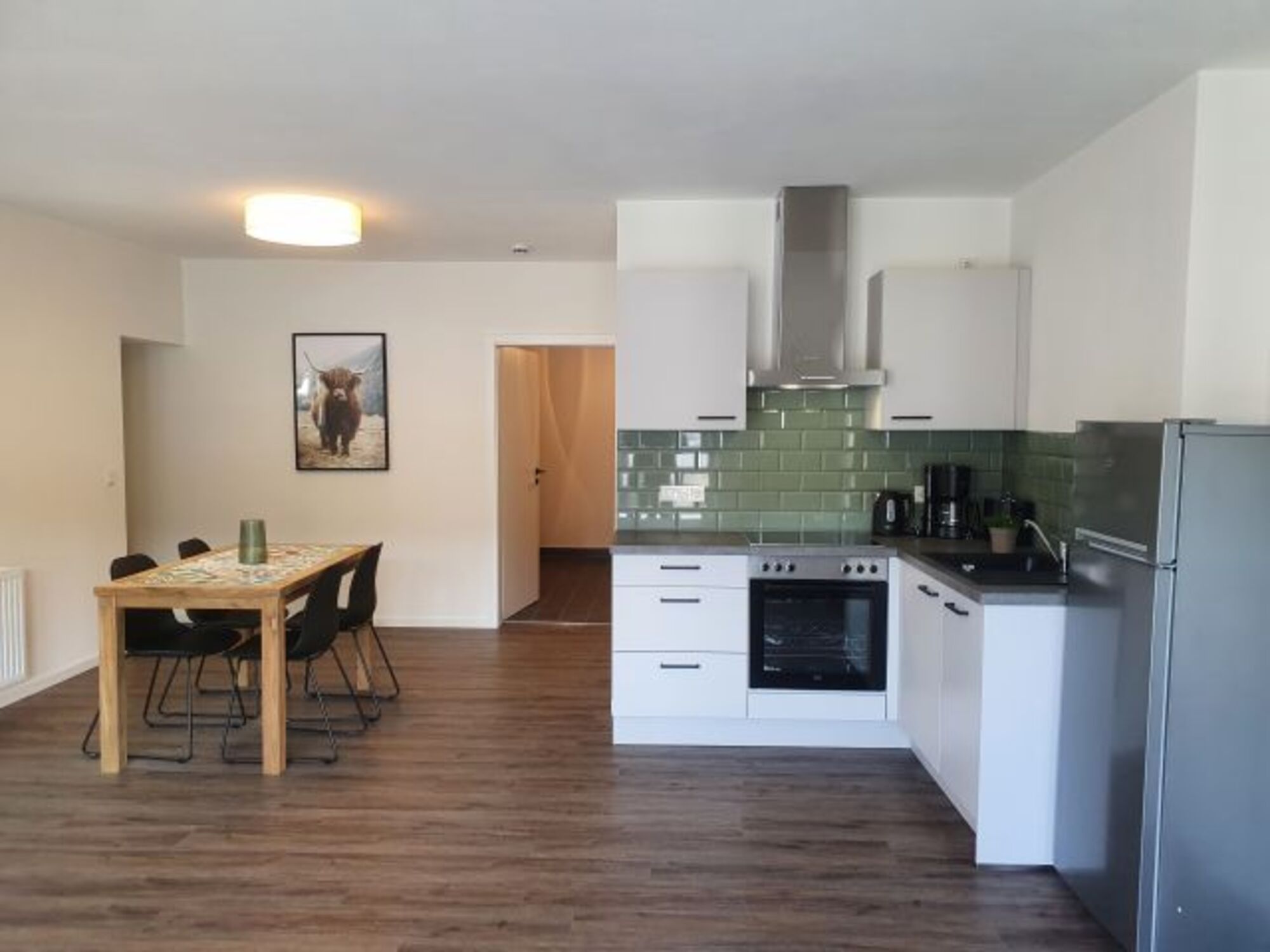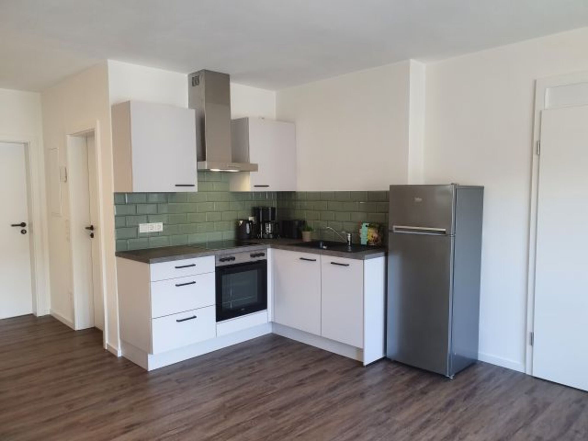 Moderne Küche mit Spülmaschine, Herd mit Backofen und Ceranfeld, Kaffeemaschine, Toaster, Wasserkocher, Kühlschrank mit separatem Gefrierfach.