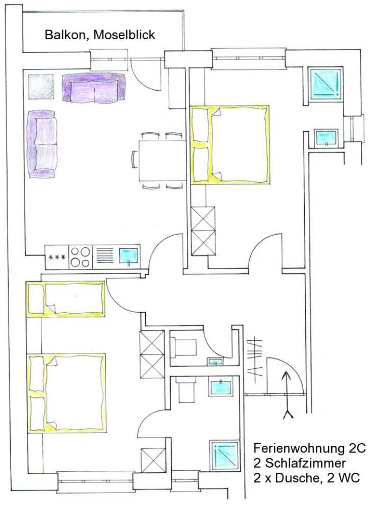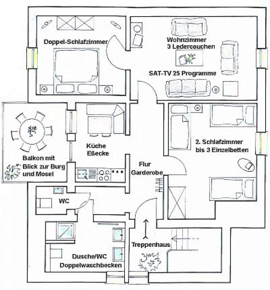 Unsere Gäste fühlen sich in unseren individuell ausgestatteten Ferienwohnungen das ganze Jahr über wohl. Für 2 Personen bieten wir gern unseren schiefergedeckten Ferienbungalow an, Mosel-Ferienwohnung Typ3: Doppelschlafzimmer, Wohn-/Esszimmer, Badezimmer mit Dusche/WC , Balkon mit Blick auf Weinberge und die abendlich beleuchtete Burg Landshut.Für 3 bis 8 Personen bieten wir Ferienwohnungen mit bis zu 3 Badezimmern an, 3 Doppelschlafzimmer plus Einzelbetten, Wohn/Esszimmer mit Essbereich, Kitchenette, Sitzecke mit Couchen, Sat-TV. Diese sind bei Familien und befreundeten Paaren besonders beliebt.