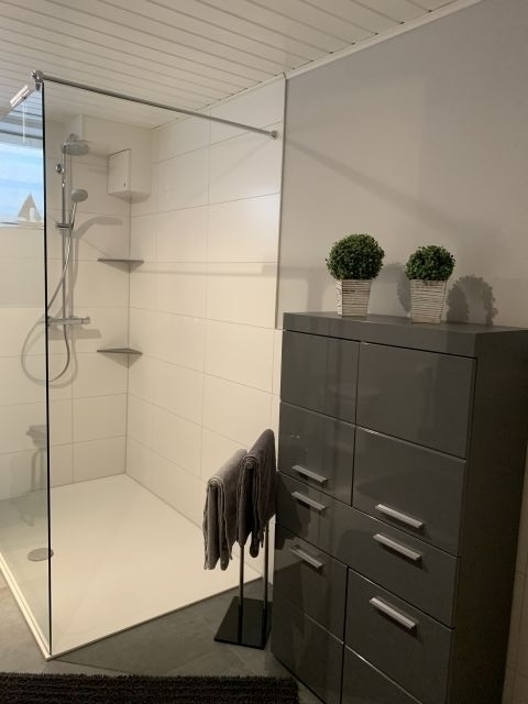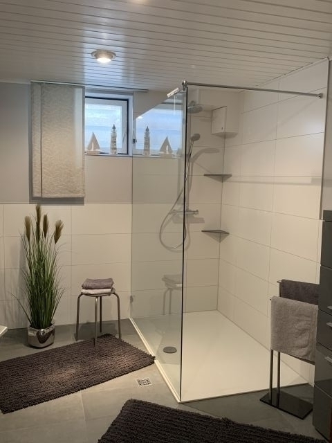 Das moderne Badezimmer mit begehbarer Dusche wurde im März 2022 komplett saniert.