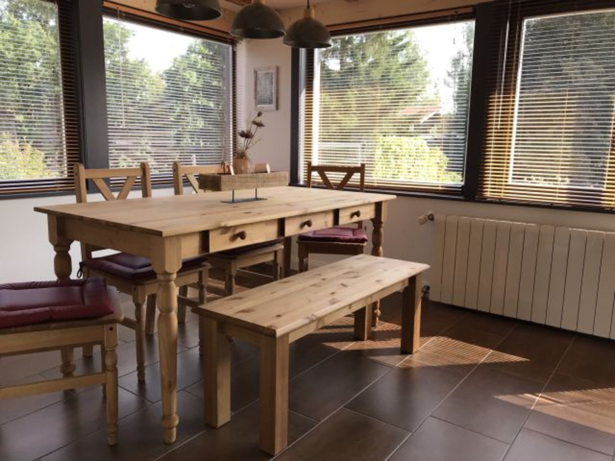 Durch einen kleinen Eingangsbereich gelangt man in die sonnendurchflutete Veranda. Hier befinden sich der Essbereich und eine Leseecke.
