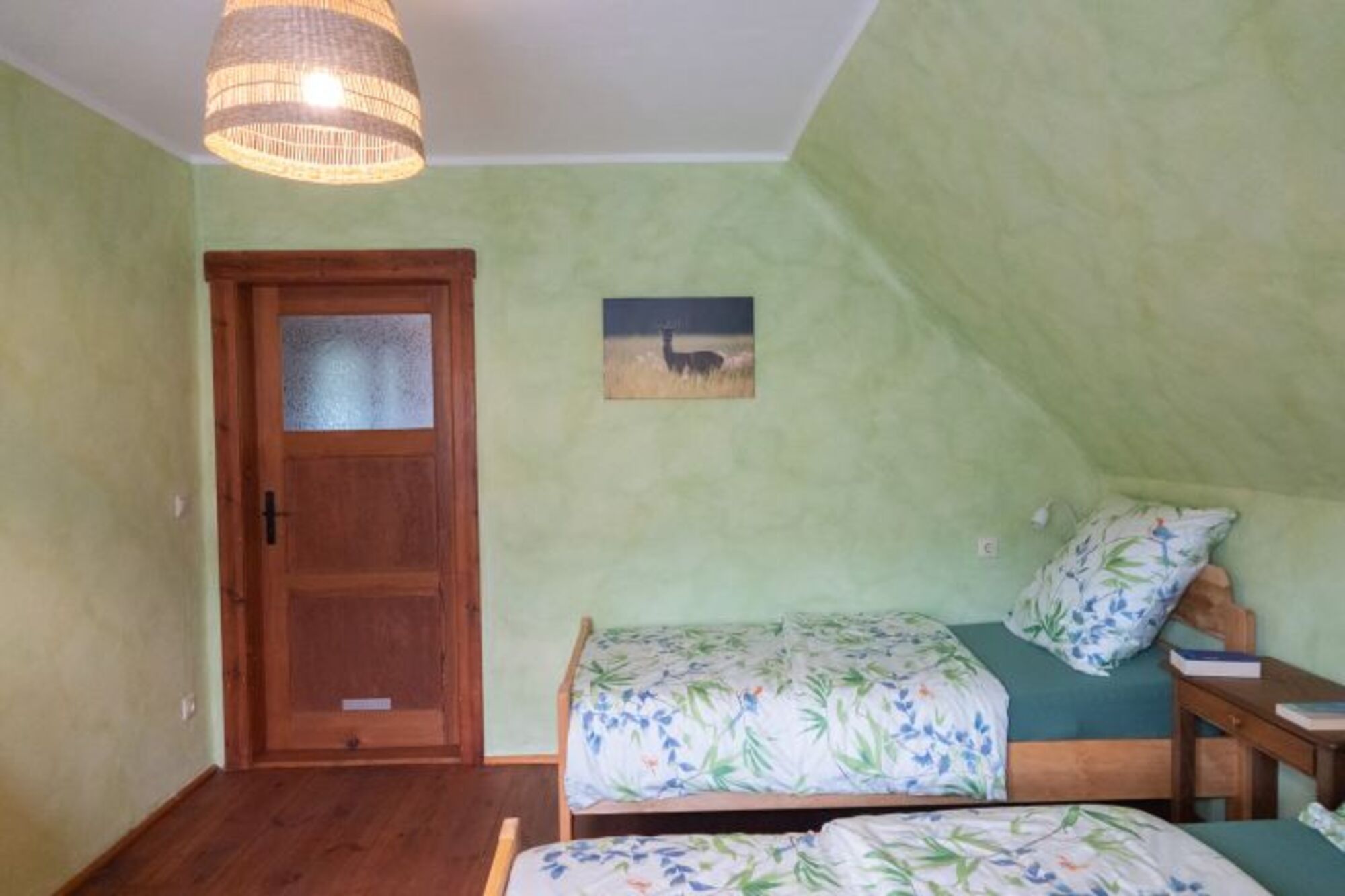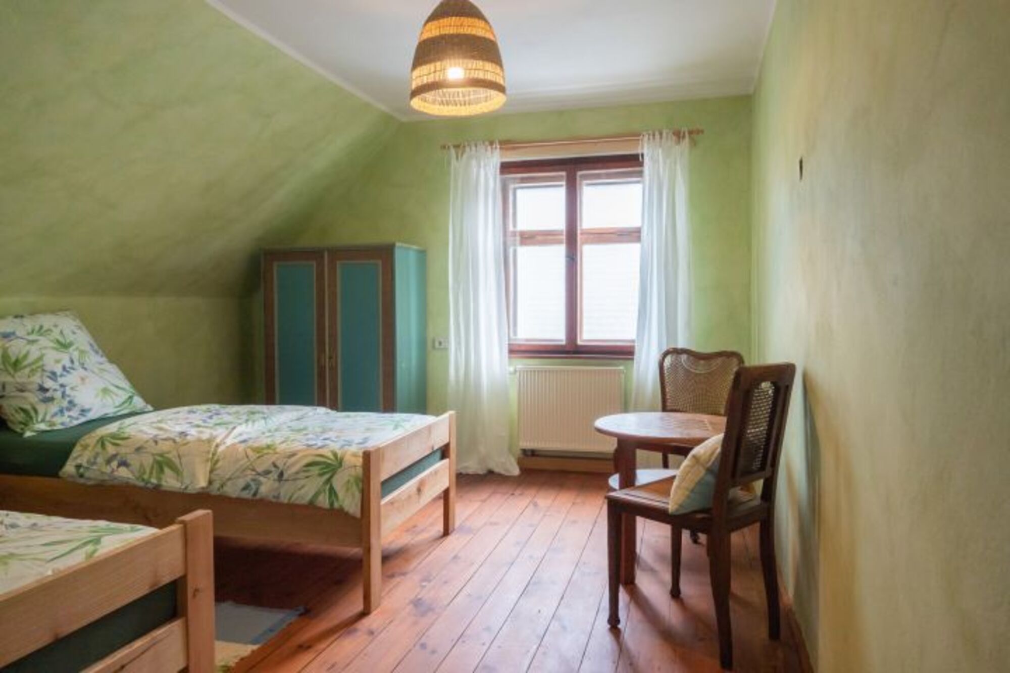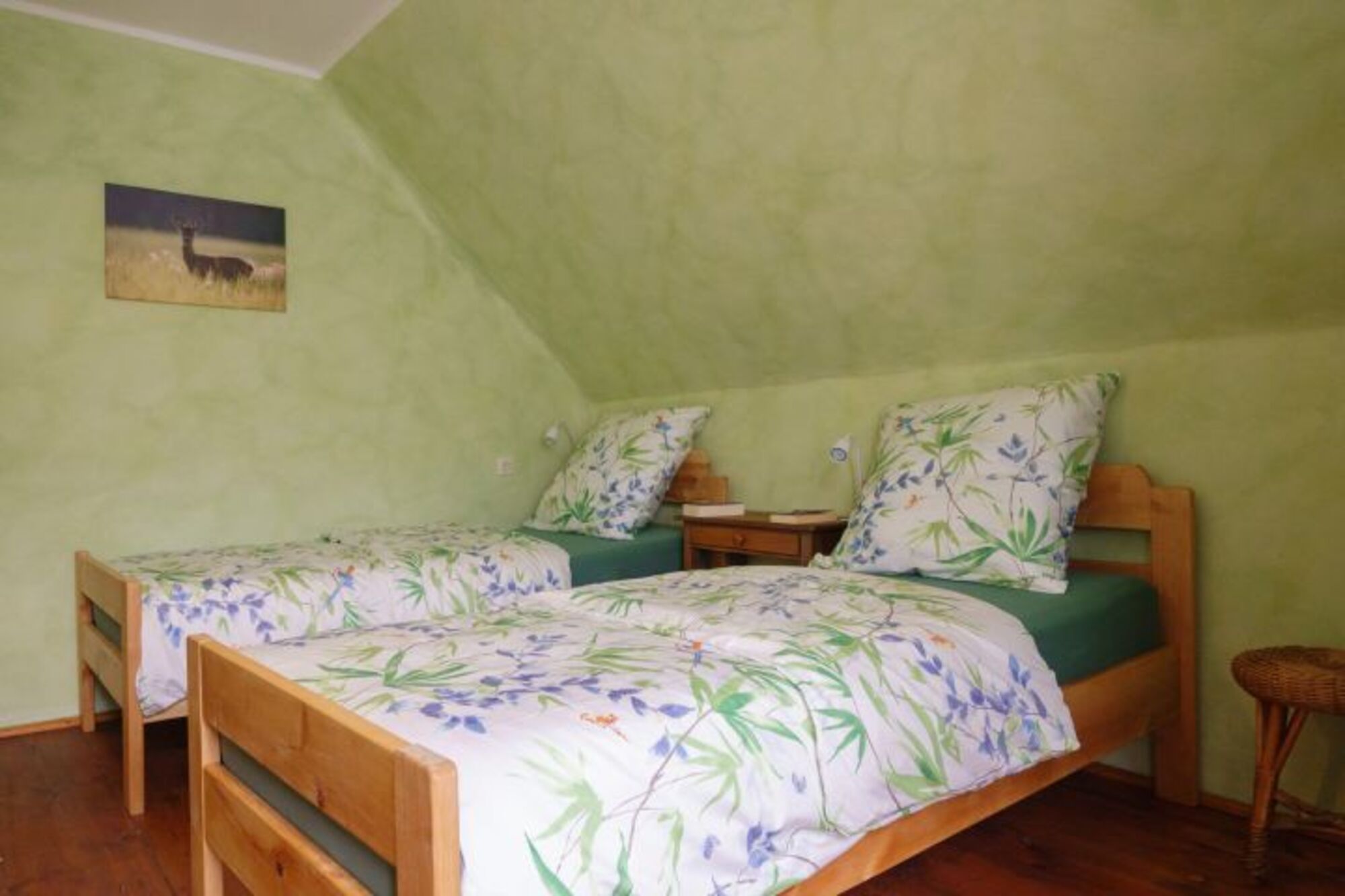 Im Obergeschoss gibt es zwei Schlafzimmer: eines mit einem Doppelbett und eins mit zwei Einzelbetten.