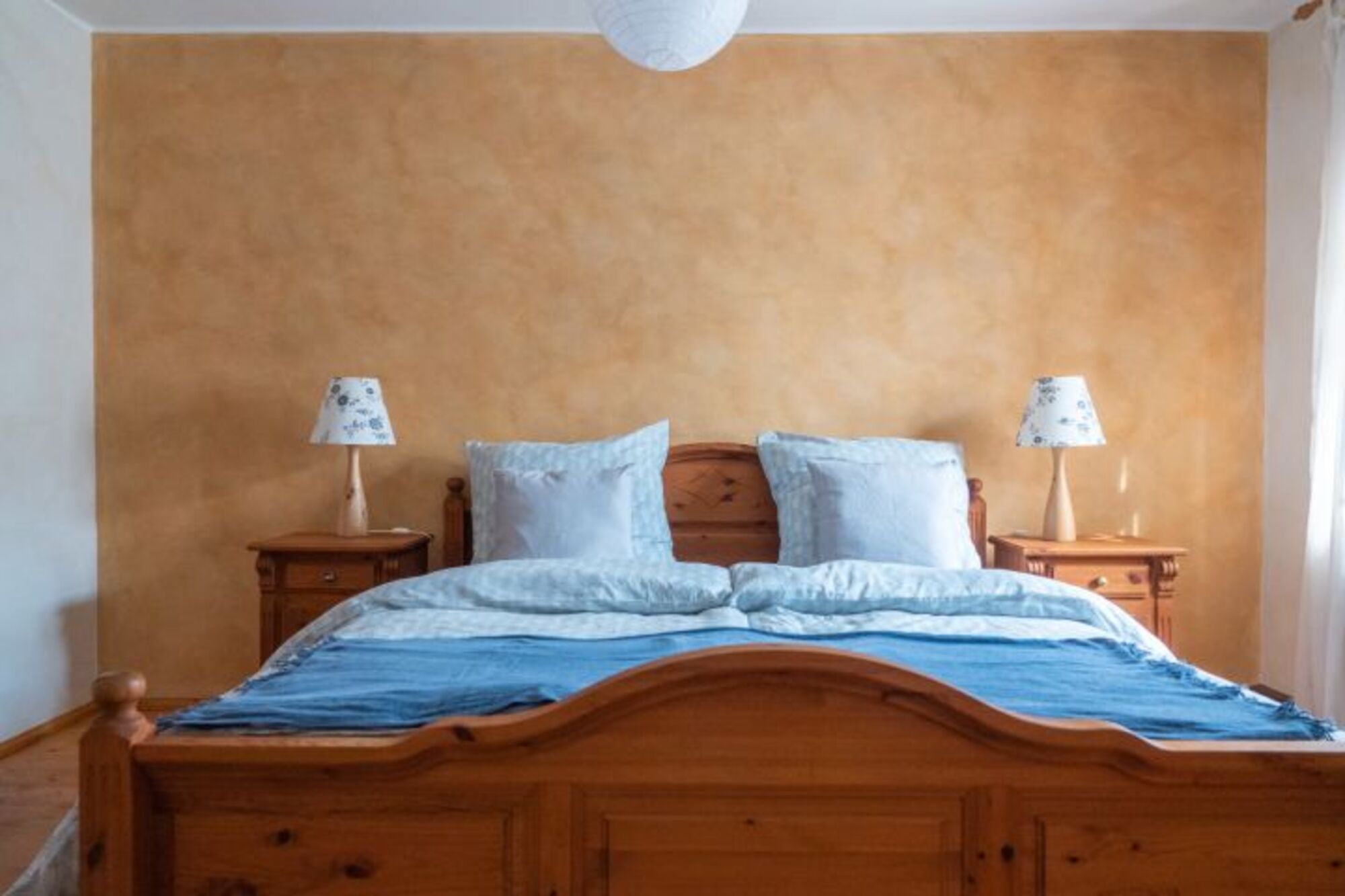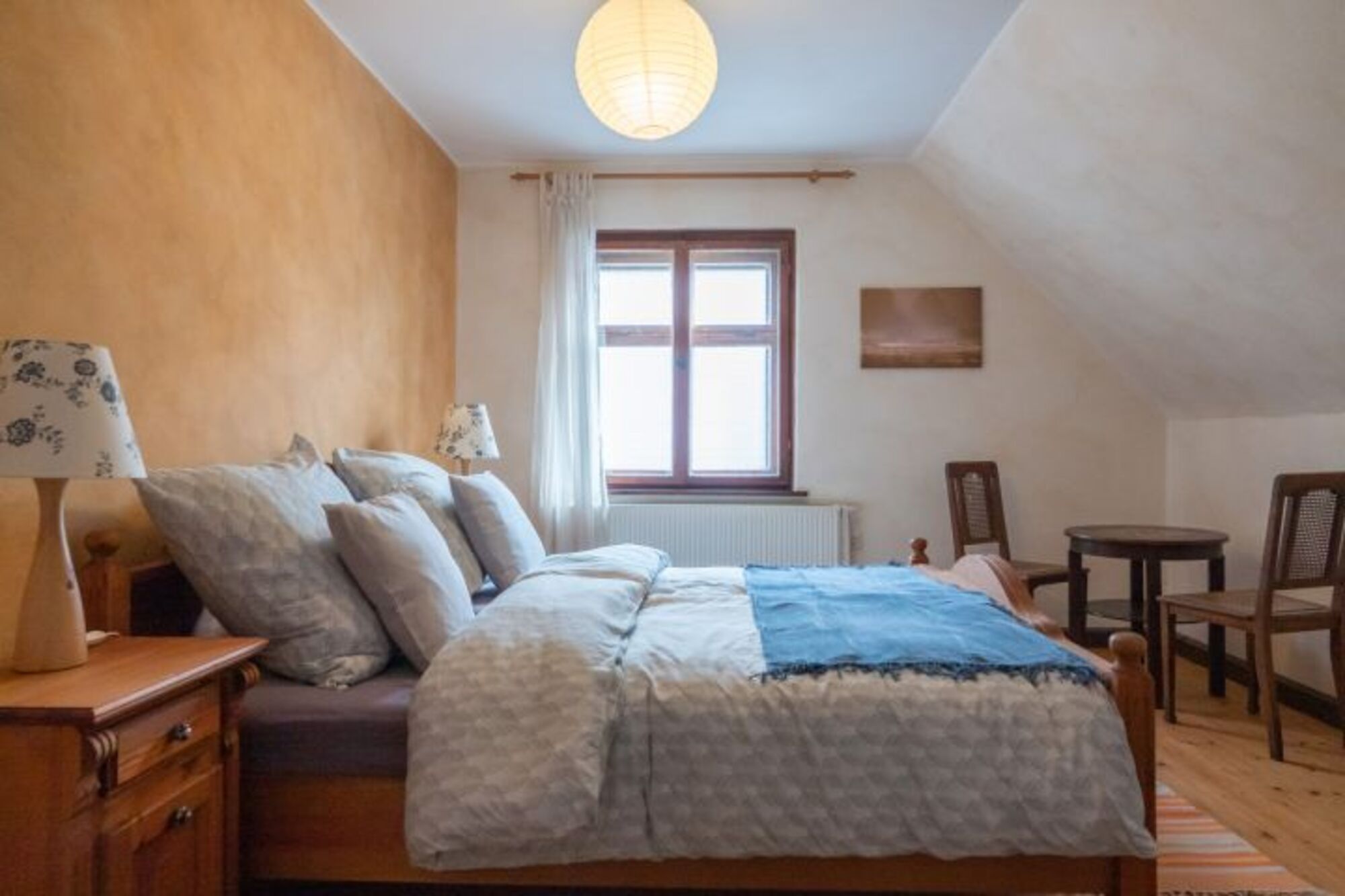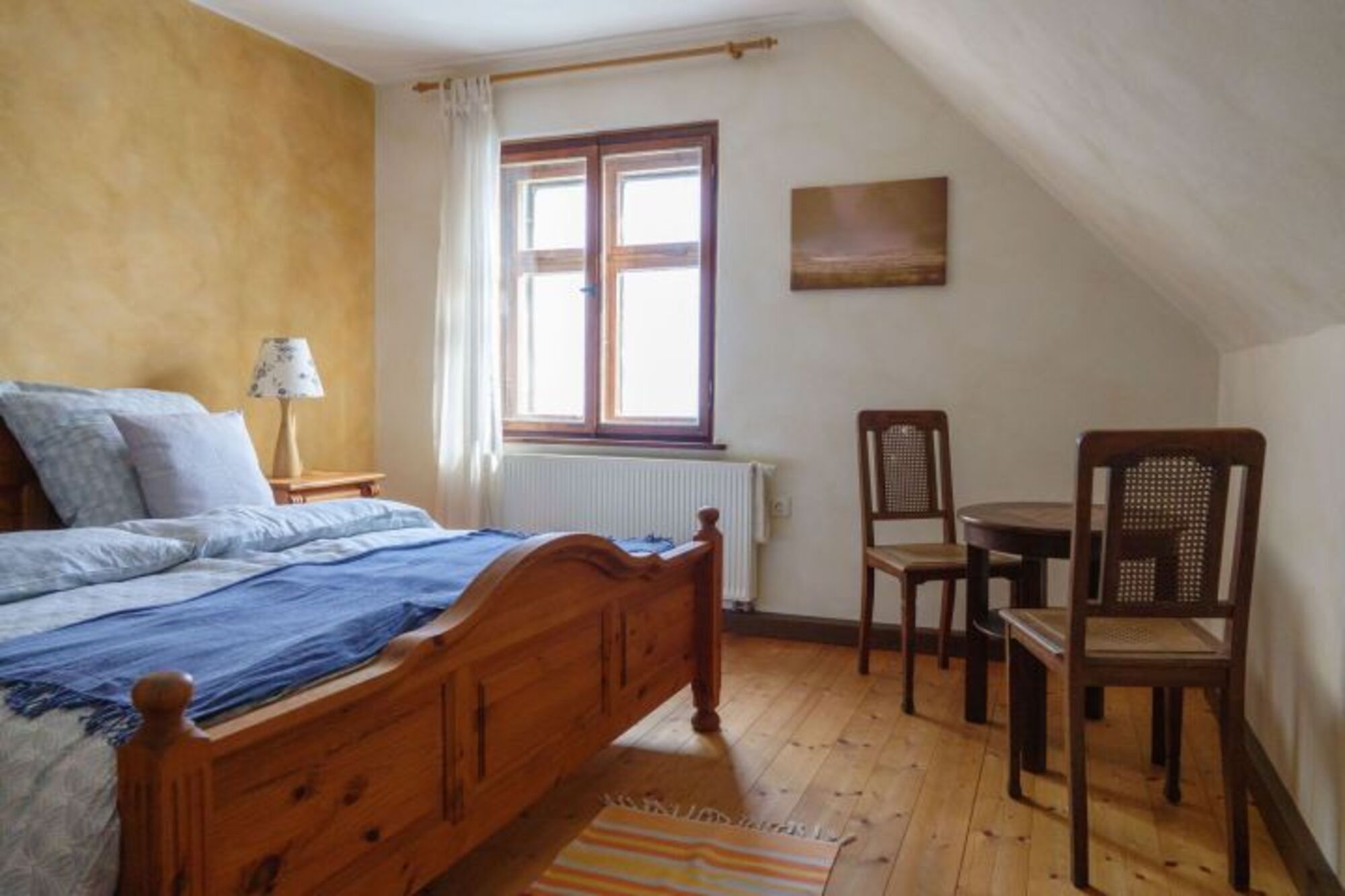 Im Obergeschoss gibt es zwei Schlafzimmer: eines mit einem Doppelbett und eins mit zwei Einzelbetten.