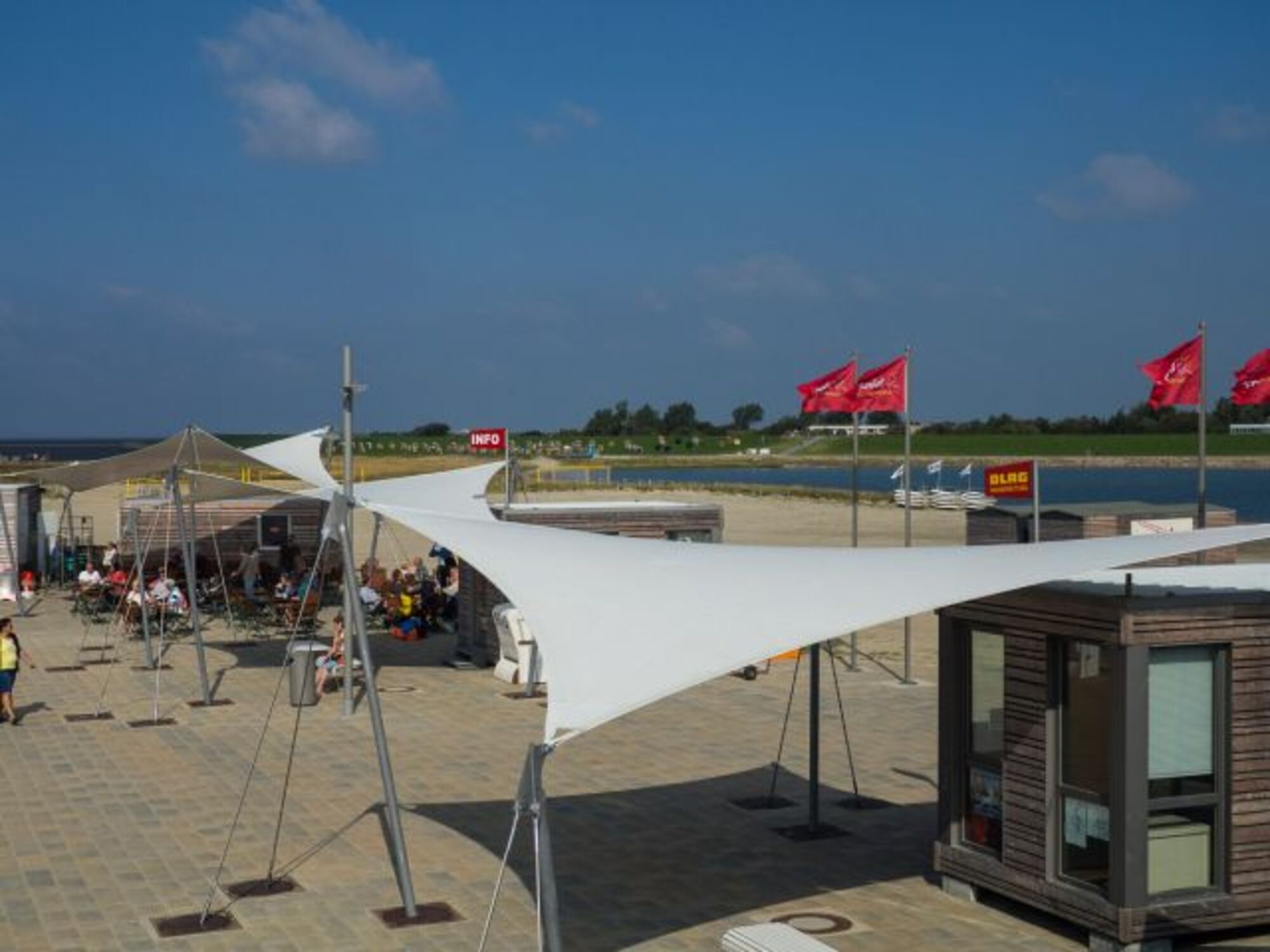 Die 2013 umgestaltete "Familienlagune Perlebucht". Ein Sandstrand mit Dünengräsern, Strandkörben, Badesee und Wassersportmöglichkeiten wie Treetbootfahren. Windsurfen und Kitesurfen. Die Becken sind unabhängig von Ebbe und Flut, Sie können hier jederzeit baden und surfen.