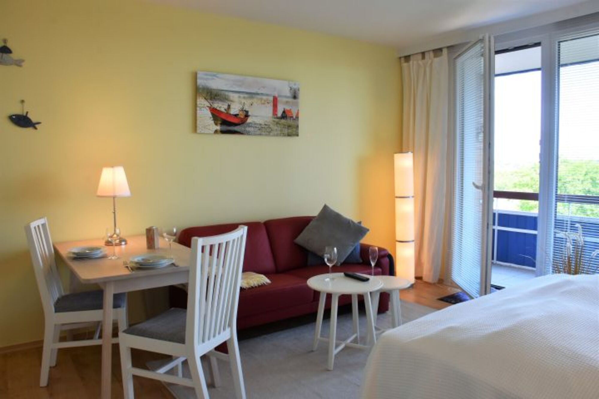 Unsere komfortable Einraumwohnung befindet sich im 4. Stock.Beginnen Sie Ihren Urlaubstag mit einem Frühstück auf dem Balkon und lassen den Blick über die See schweifen. Relaxen Sie auf den Liegestühlen mit Tisch und Sonnenschirm.