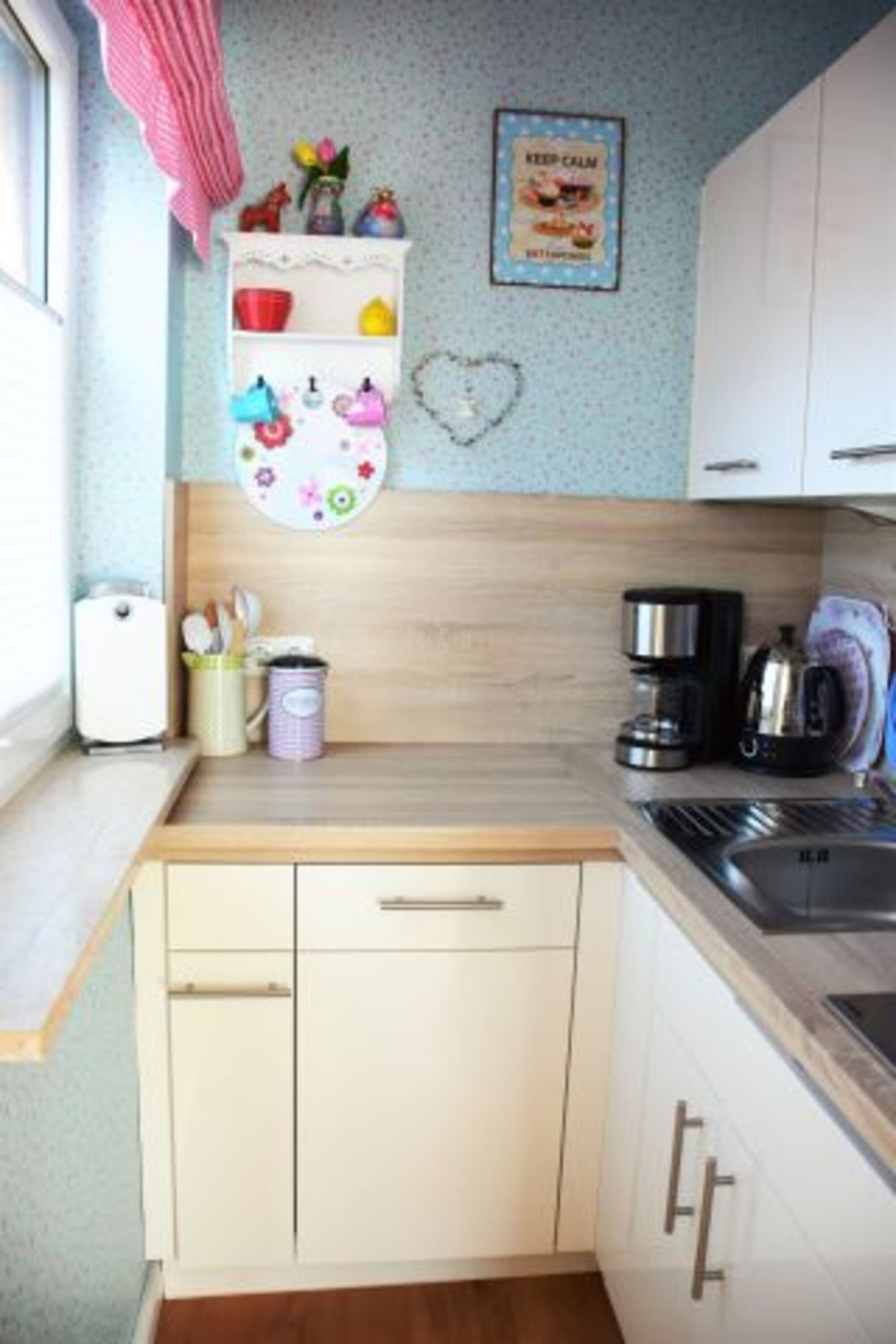 Die kleine Küche ist mit allen nötigen Haushaltsutensilien ausgestattet, um sich auch im Urlaub gut selbst versorgen zu können, inkl. Geschirrspüler und Mikrowelle.