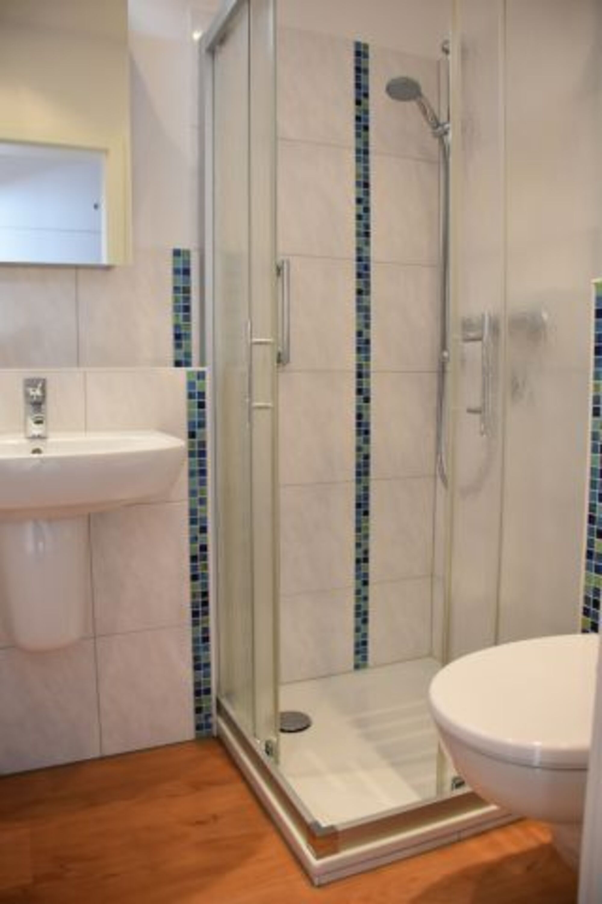 Das Bad ist hell gefliest mit einer Dusche, Waschbecken und WC.