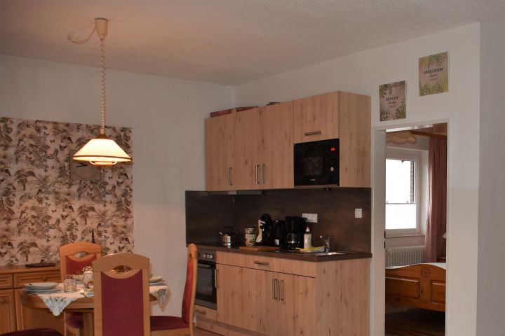 Küchenzeile bestehend aus Kochfeld, Backofen, Spülbecken, Kühlschrank mit Eisfach, Kaffeemaschine. Bestecke und Geschirr für den täglichen Bedarf sind natürlich vorhanden.