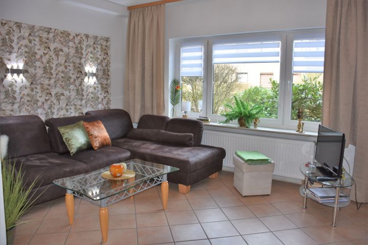 Die 2-Raum-Ferienwohnung liegt im Erdgeschoss mit Terrasse in einer kleinen Anlage mit 9 Wohneinheiten. Es ist ca. 40 qm groß und bietet Platz für 2 bis 4 Personen.Wohnraum mit Couchgarnitur die nach Bedarf auch als Schlafcouch für 2 Person genutzt werden kann. Flachbild-TV und Essplatz.