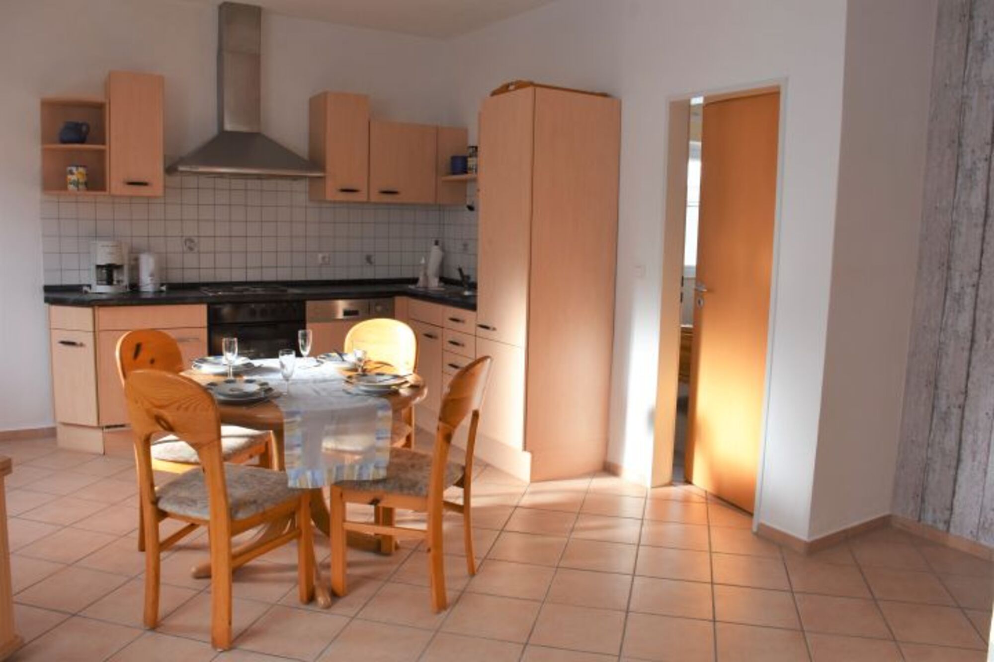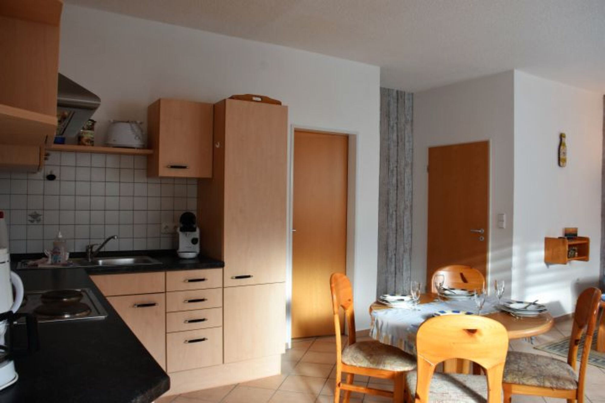 Küchenzeile bestehend aus Elektroherd mit vier Kochplatten, Backofen, Geschirrspüler, Spülbecken, Kühlschrank, Kaffeemaschine. Bestecke und Geschirr für den täglichen Bedarf, sind natürlich vorhanden.