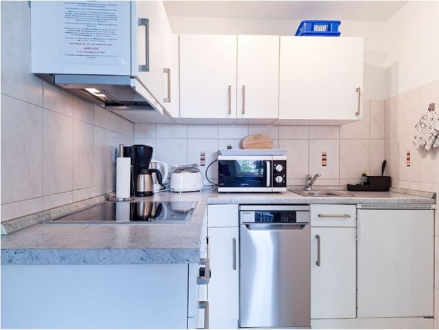 Eine voll ausgestattete Küche mit Mikrowelle, Backofen, Herd mit Ceranfeld, Wasserkocher, Toaster usw. usw.