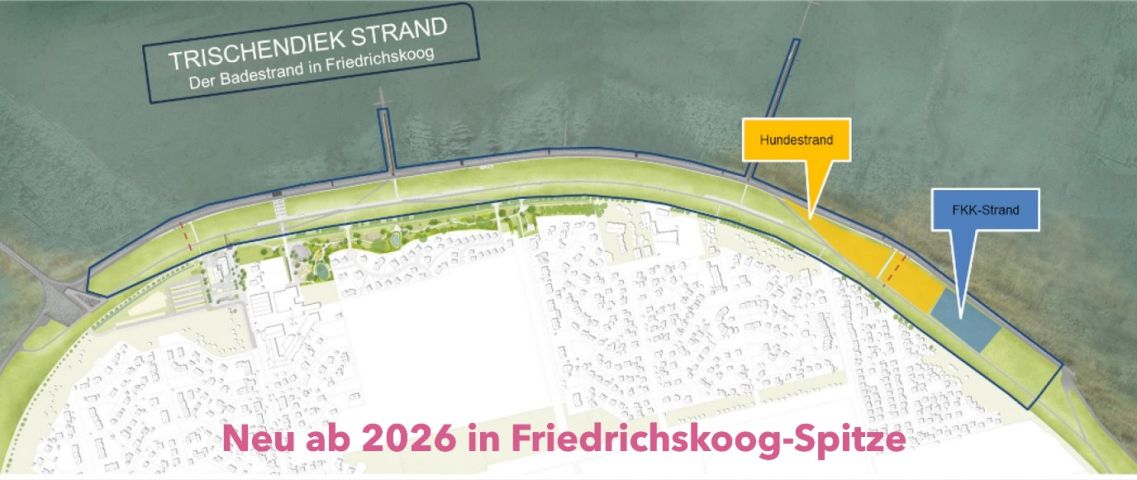Bis zum neugestalteten Klimadeich und dem ca. 2,5 Kilometer langen Badestrand "Trischendiekstrand" (Fertigstellung Ende 2025 - Anfang 2026) von Friedrichskoog-Spitze mit Familienstrand, Hundestrand und FKK-Strand sind es nur 800 Meter.Ebenfalls nur 800 Meter entfernt ist der neu gestaltete Kurpark (Neueröffnung April 2025) mit großem Festplatz für die im Juli und August stattfindeten "Deichfestivals".