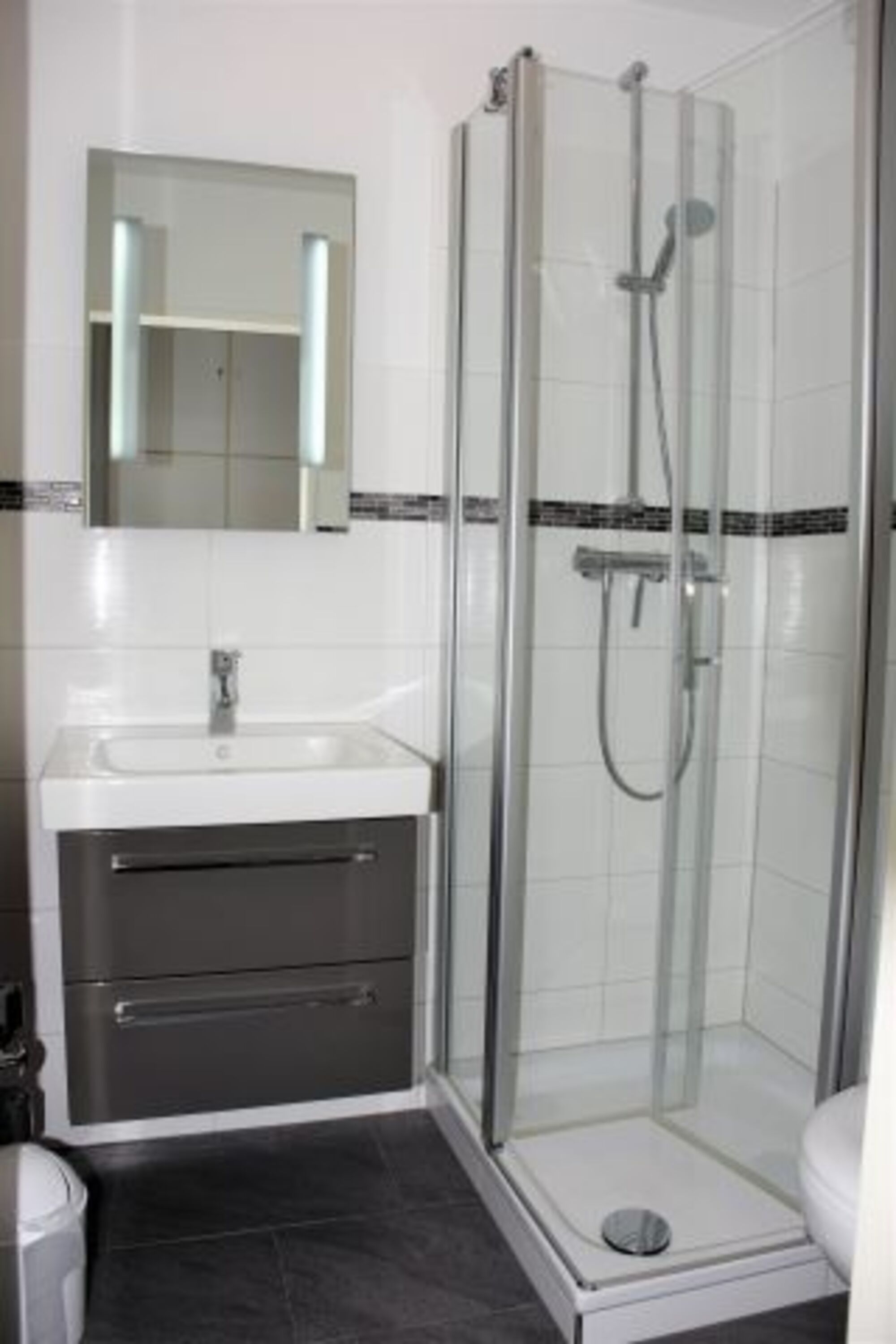 Das Bad ist hell und freundlich mit einer Dusche, Waschtisch mit geräumigen Unterschrank und WC.