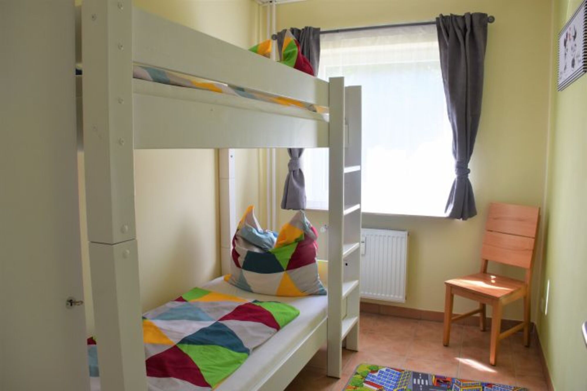 Im Kinderzimmer befindet sich ein Etagenbett und ein kleiner Kleiderschrank. Das Bad verfügt über Dusche, WC, Spiegelschrank, Ablage und Fön.
