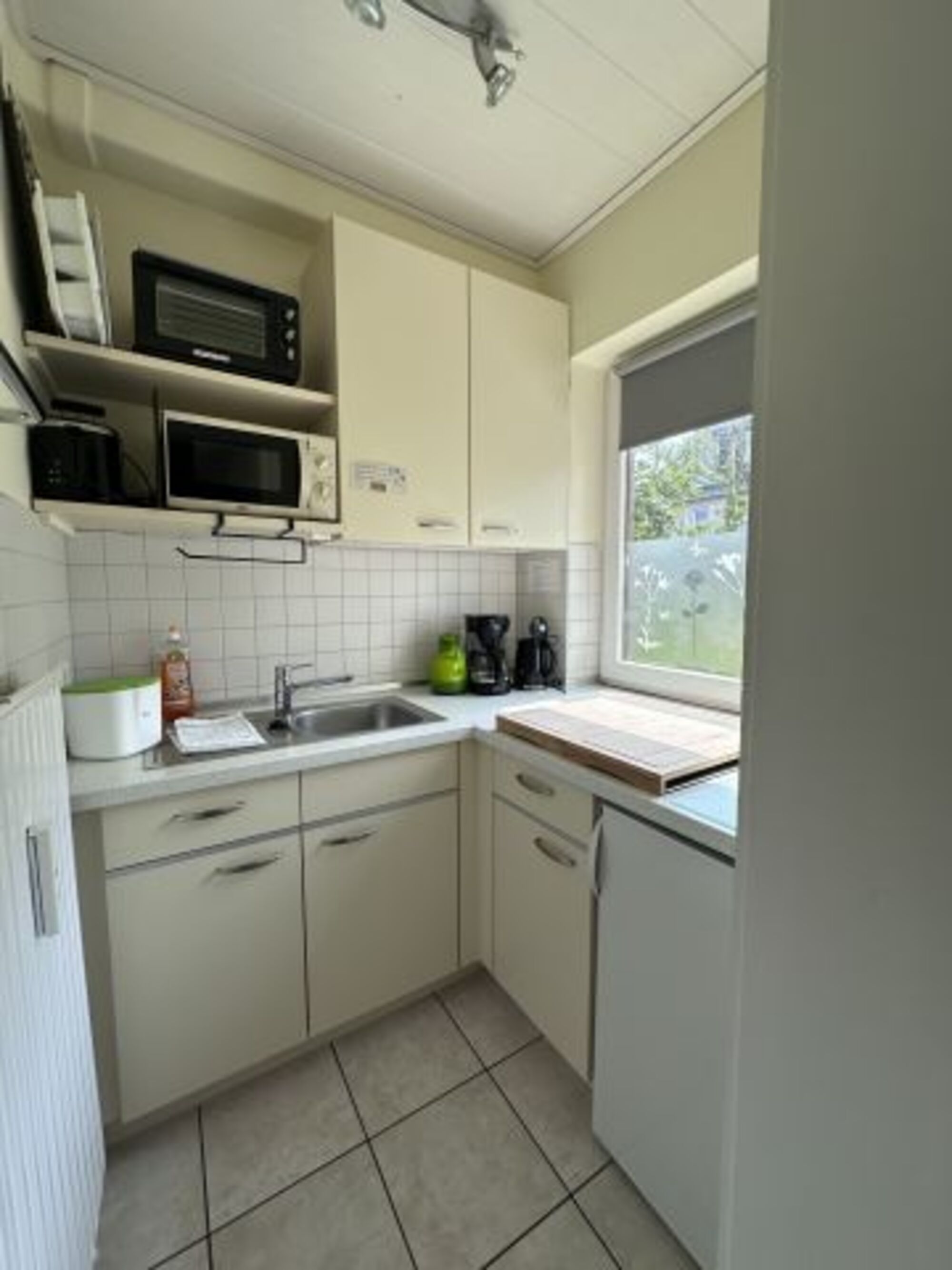 Die sep. eingerichtete Einbauküche, die über ein Ceranfeld mit vier Kochzonen verfügt und mit allen nötigen Küchenutensilien, inkl. Mikrowelle mit Grill/Heißluftofen, Kaffeemaschine, Wasserkocher, Toaster, Kühlschrank mit Gefrierfach ausgestattet ist, macht einen Restaurantbesuch überflüssig.