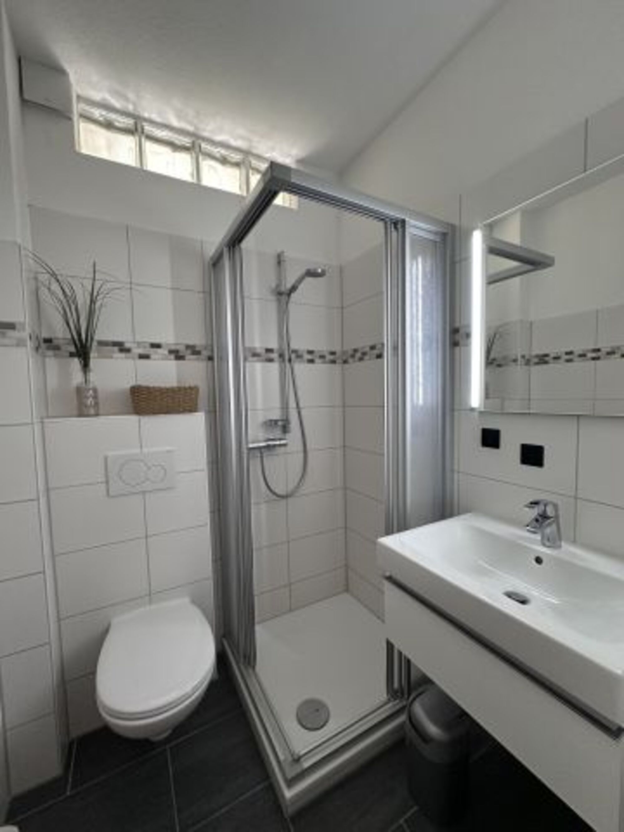 Unsere moderne Dreiraumwohnung befindet sich im Erdgeschoß hat eine Größe von ca. 54 qm und bietet Platz für zwei bis 4 Personen.Das geschmackvoll eingerichtete Wohnzimmer ist ausgestattet mit einer Essecke mit 4 Stühlen, einer Dreiercouch aus Leder mit einem Ledersessel, Couchtisch, Vitrine und Sideboard, Flachbild- TV.