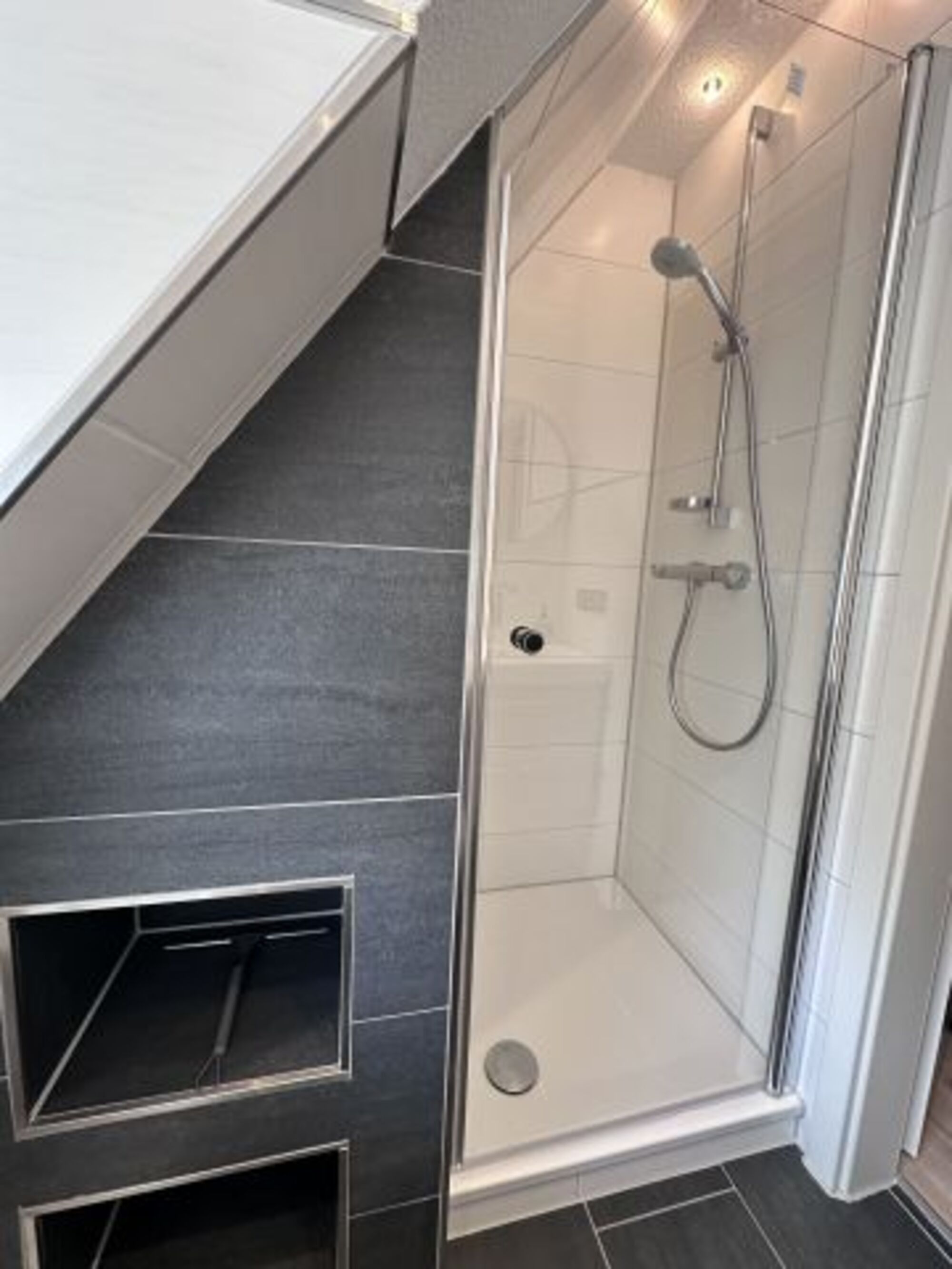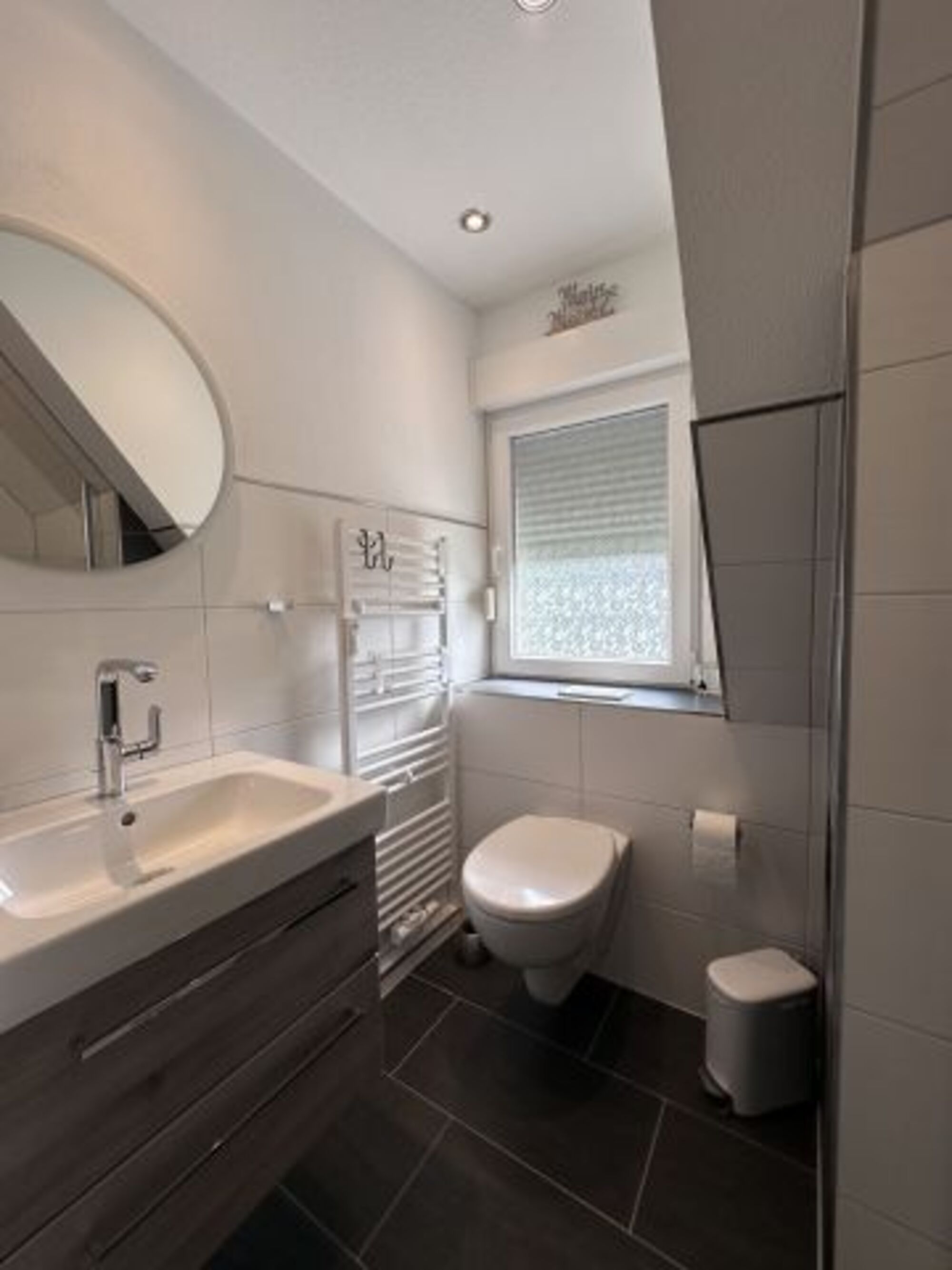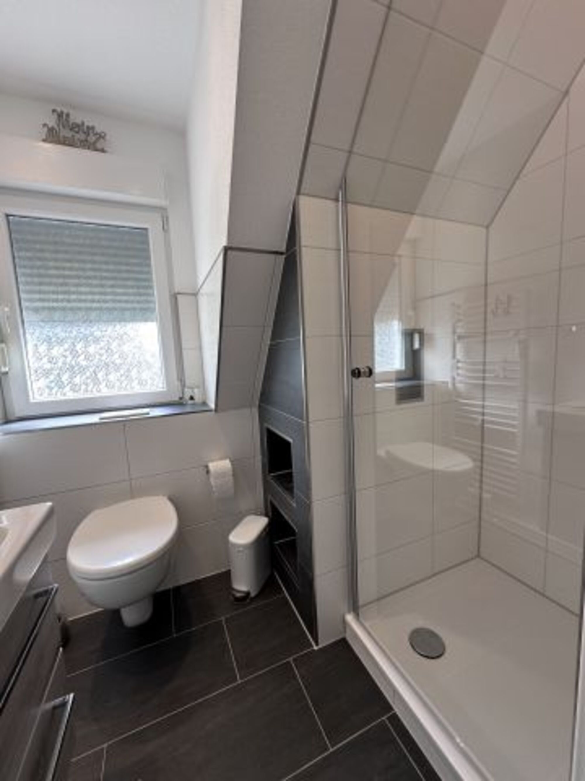 Das helle Tageslichtbad ist funktional mit Dusche und WC.