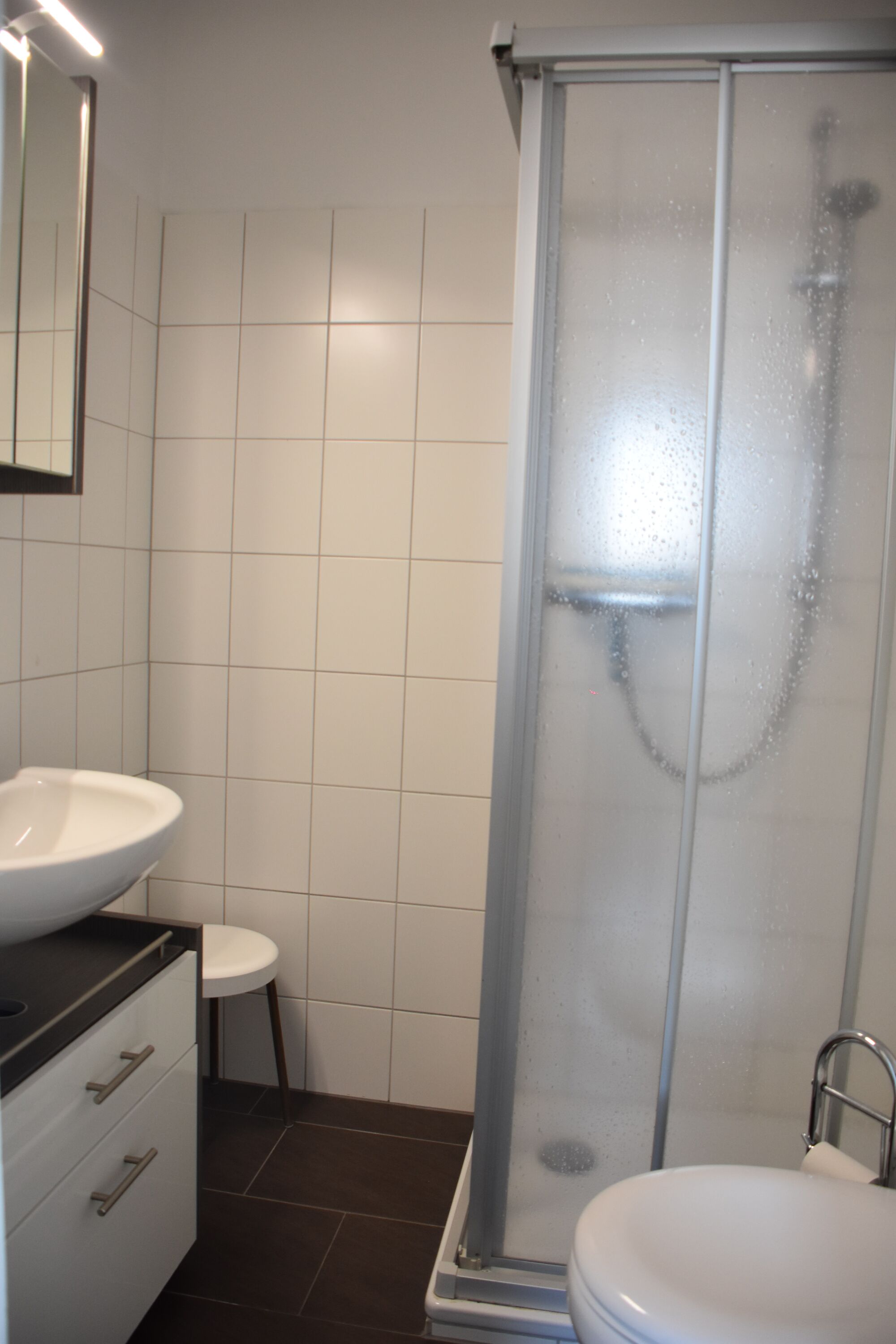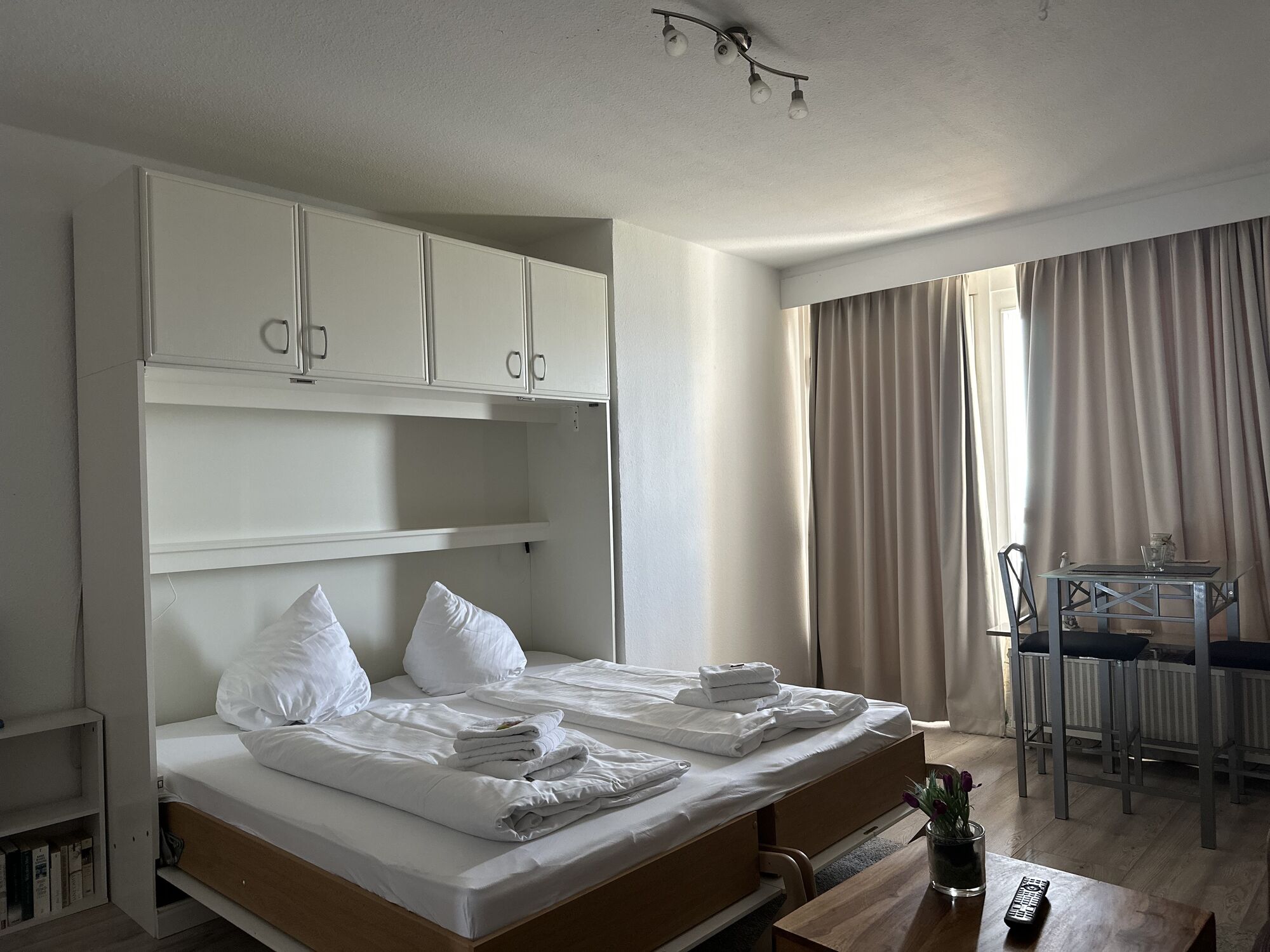 Zur Wohnung gehören eine voll ausgestattete Küche, der Wohnraum mit Appartementwand, Couchgarnitur und Kabel-TV, sowie Dusche/WC