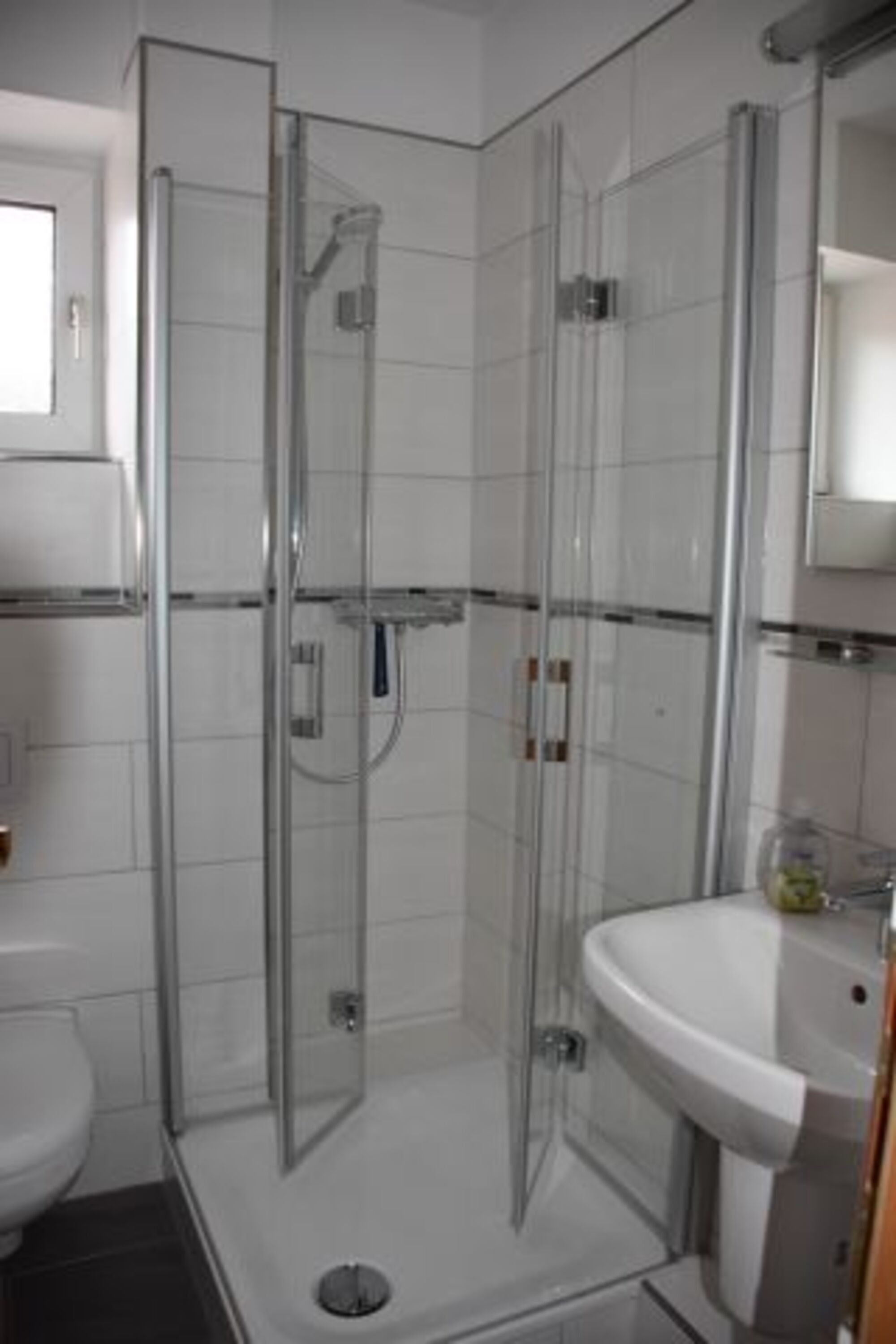 Das Tageslichtbad ist funktional mit Duschkabine, Waschbecken und WC.