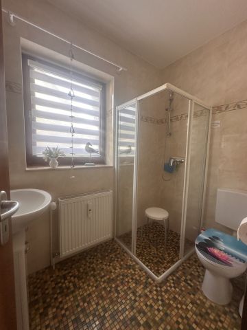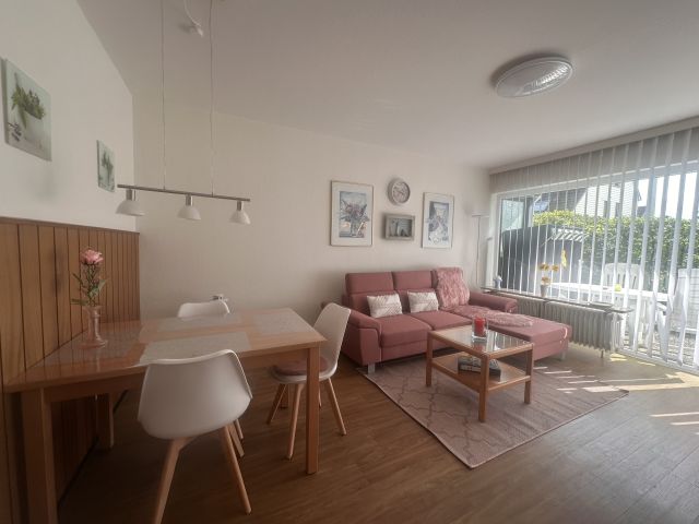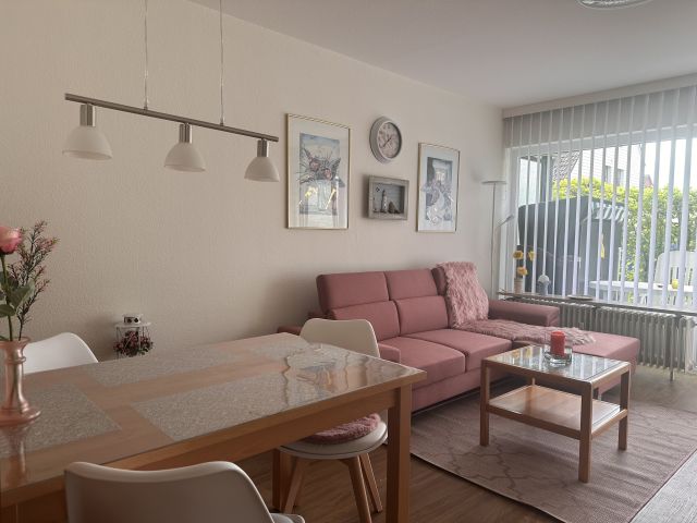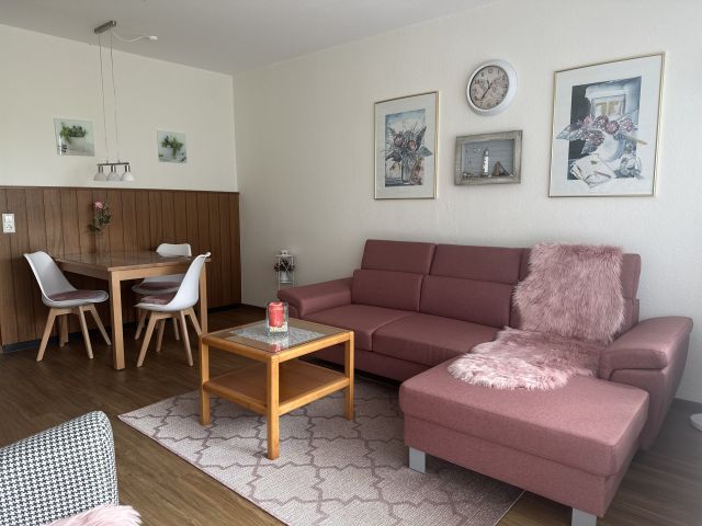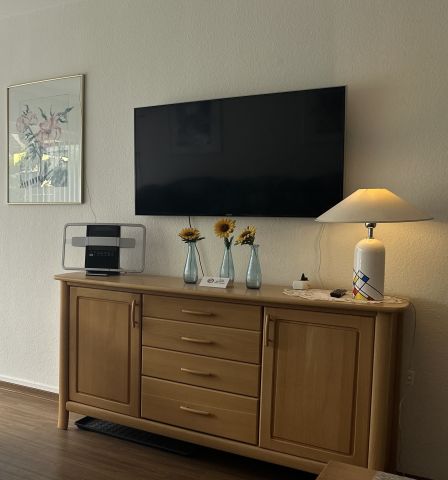 Das Wohnzimmer ist ausgestattet mit einer gemütlichen Couchgarnitur, die nach Bedarf auch als Schlafcouch genutzt werden kann, einem Esstisch mit 4 Stühlen und großem Flachbild-TV mit Sat-Anschluss. Zur Wohnung gehören weiterhin ein Schlafzimmer mit Boxspringbett, eine kleine Küche mit kompletter Ausstattung sowie ein Tageslichtbad mit Dusche und WC.
