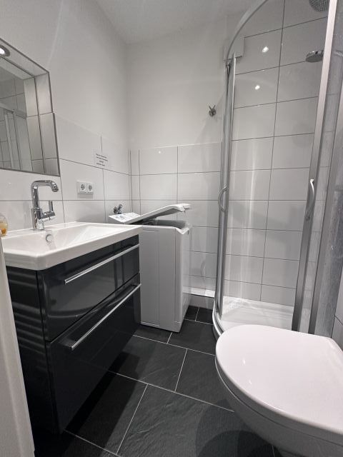 Das Bad ist hell mit einer Eckdusche, Waschtisch und WC, sowie genügend Stauraum für Ihre Kosmetika.