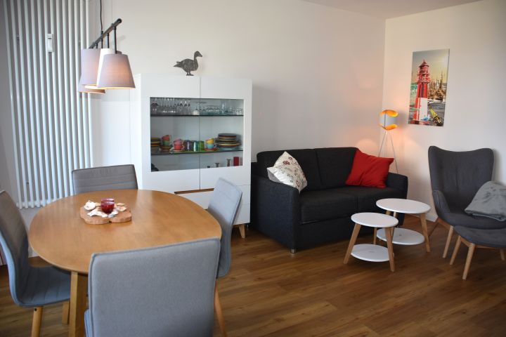 Die 2017 neurenovierte 2-Raumwohnung befindet sich in der 2. Etage im Haus Eggert. Sie ist modern gestaltet und mit viel Liebe zum Detail eingerichtet. Auf 50 qm finden bis zu 4 Personen Platz.Das helle und freundliche Wohnzimmer ist mit einem Sofa ausgestattet, das für 2 Personen als Schlafmöglichkeit genutzt werden kann, sowie ein Sessel mit passendem Fußhocker. Für ruhige Fernsehabende gibt es dort einen Flachbild-TV und einen DVD-Player. Sie möchten lieber ein gutes Buch lesen? Kein Problem. Es gibt eine große Auswahl an verschiedenen Büchern zur Auswahl.