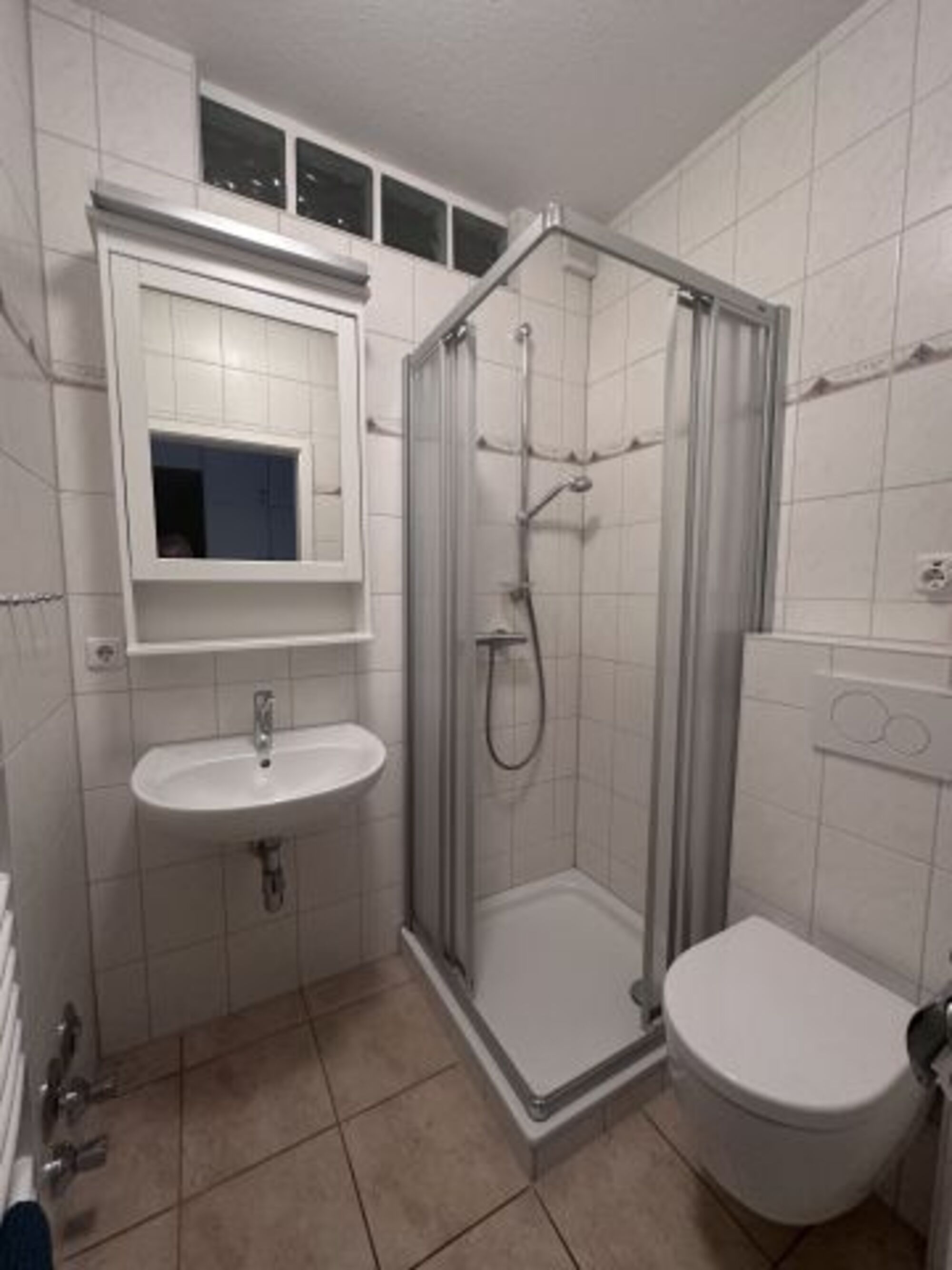 Das Bad ist funktionell mit Duschkabine, Waschbecken und WC.