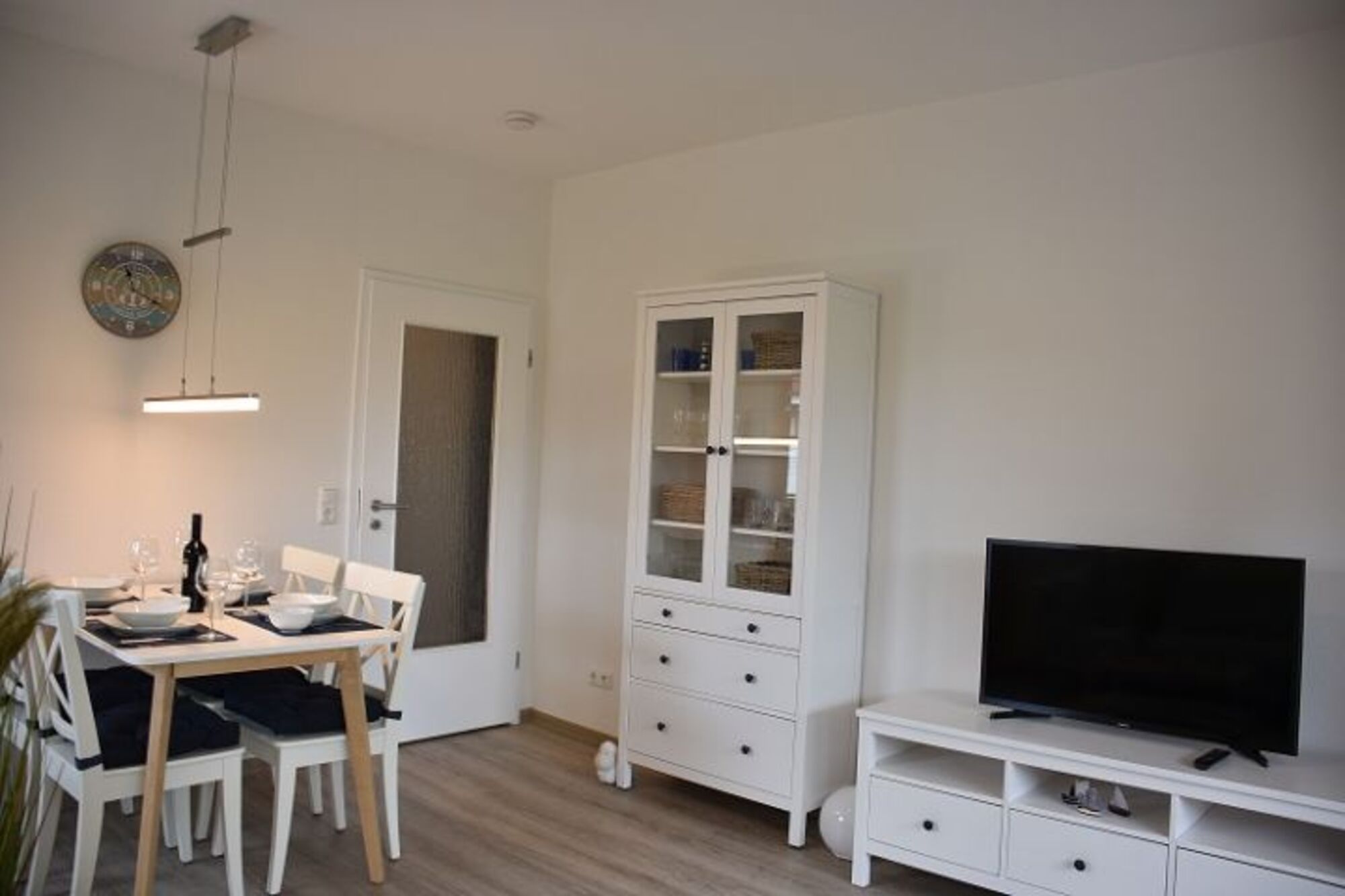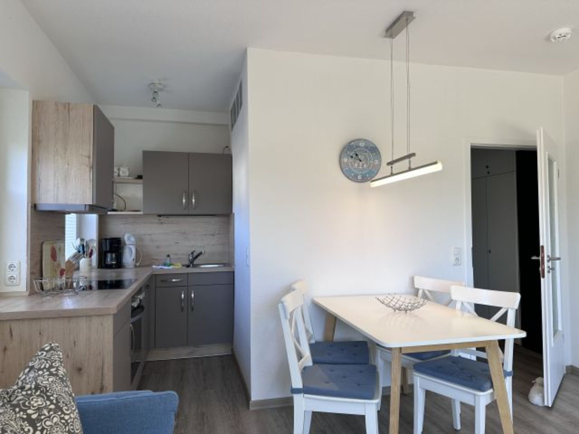 Das helle und freundliche Wohnzimmer ist ausgestattet mit einem Sofa, einem Flachbild-TV und Essplatz. Die angrenzende Küchenzeile bietet alles, was Sie zum Kochen benötigen, inkl. Geschirrspüler.
