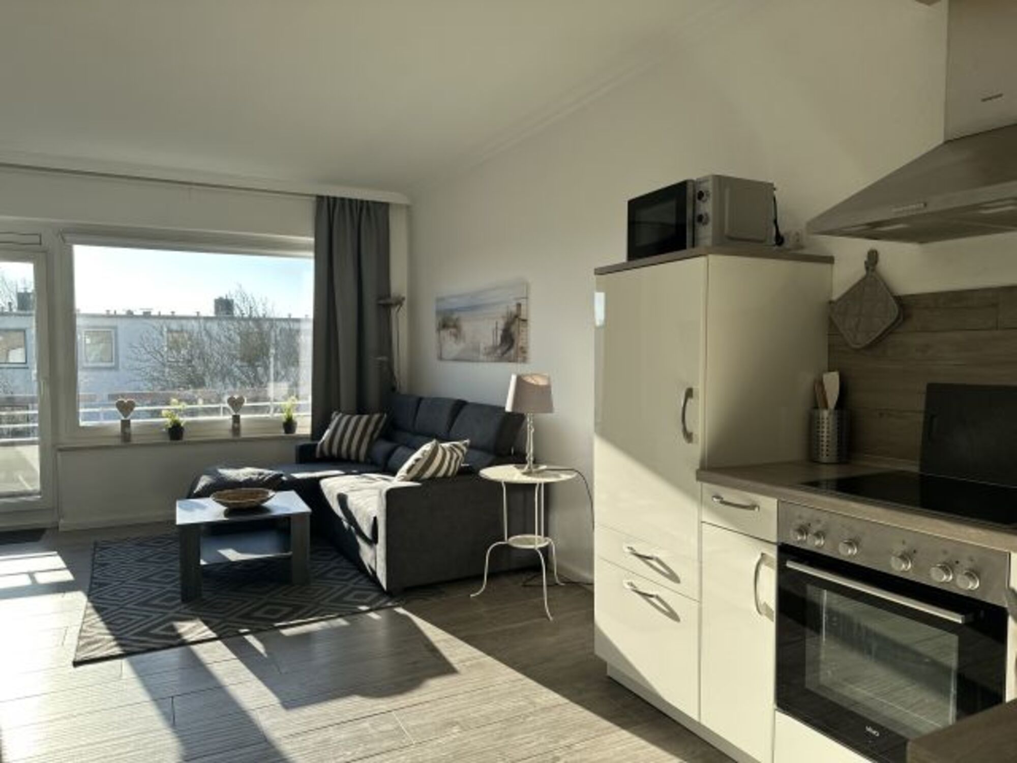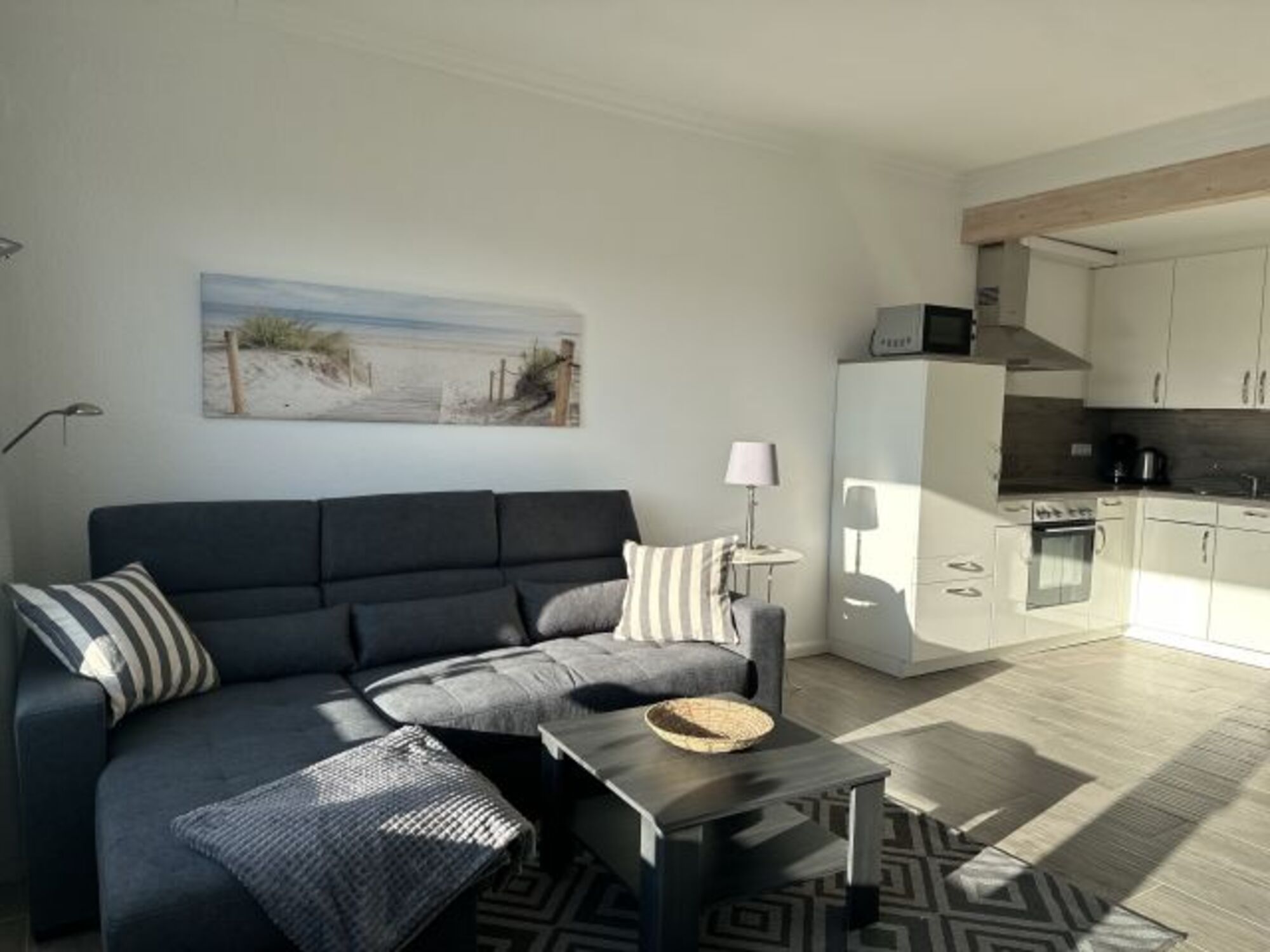Das helle Wohnzimmer mit integrierter Küche ist der ideale Aufenthaltsort für Familienabende. Entspannen Sie bei einem guten Film auf dem gemütlichen Sofa, welches auch als Schlafsofa genutzt werden kann.