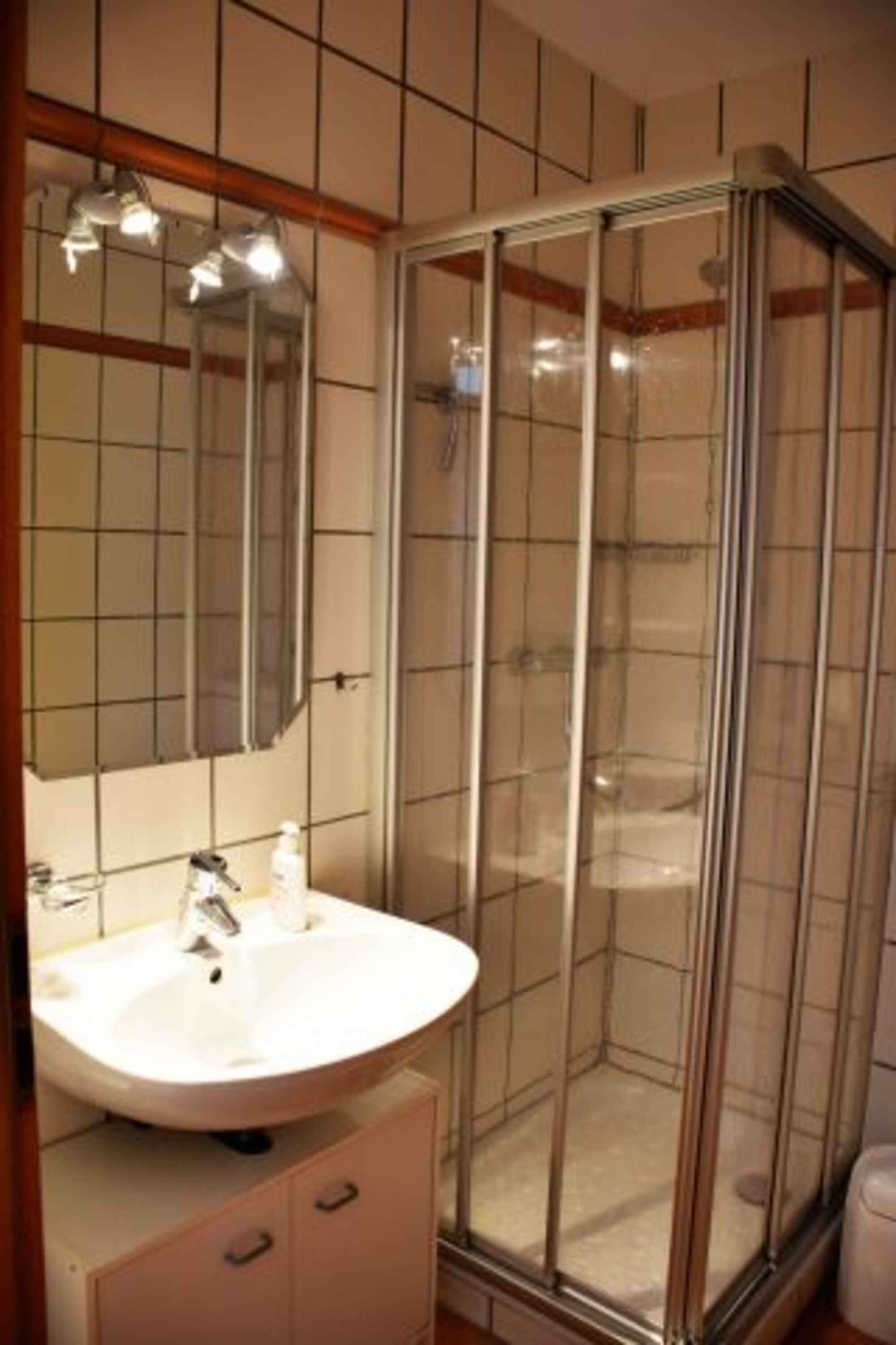 Das Duschbad ist hell mit einer Duschkabine, Waschbecken und WC.