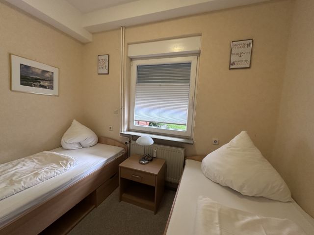 Die Wohnung verfügt über zwei Schlafzimmer, davon eins mit Doppelbett und Flat-TV. Das kleinere Schlafzimmer ist mit zwei Einzelbetten ausgestattet. An allen Fenstern befinden sich elektrische Rollläden .