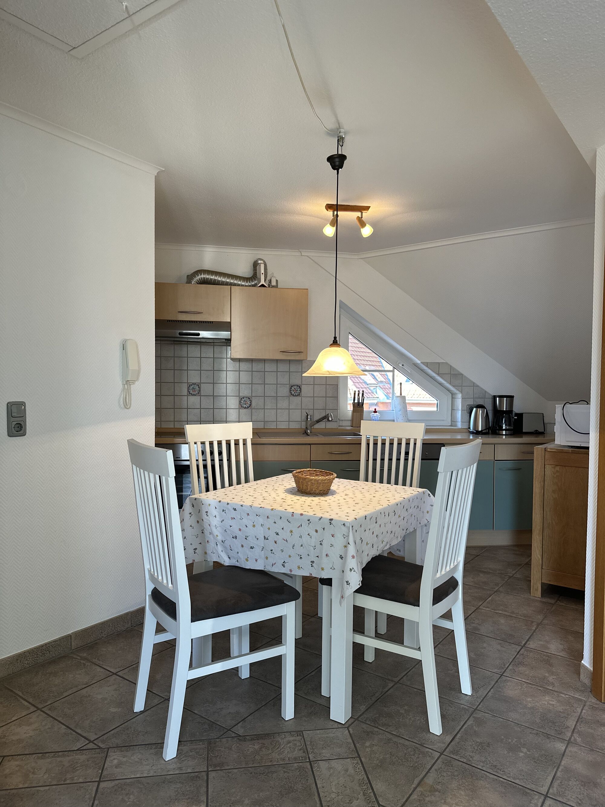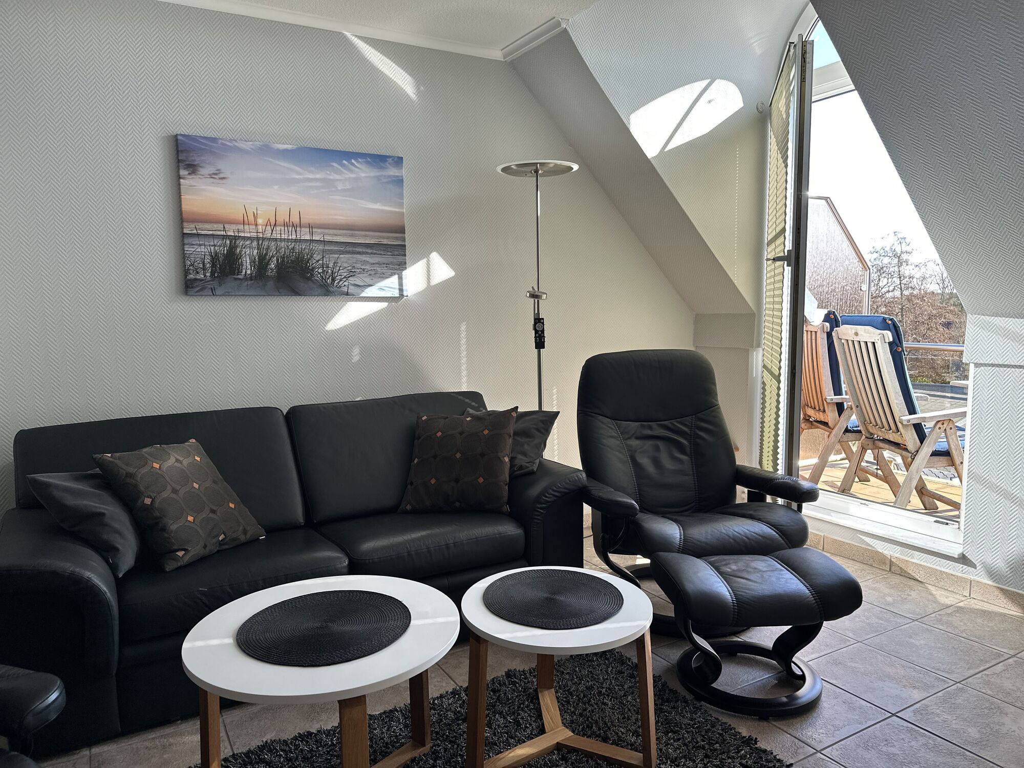 Unsere komfortable 2-Raumwohnung befindet sich im 2. OG. Auf rund 50 qm finden 2 - 3 Personen genügend Platz zum Erholen.Das Wohnzimmer ist ausgestattet mit einem Schlafsofa (für eine Person), 2 Relaxstühlen mit Fußhocker und einem Flachbild-TV.