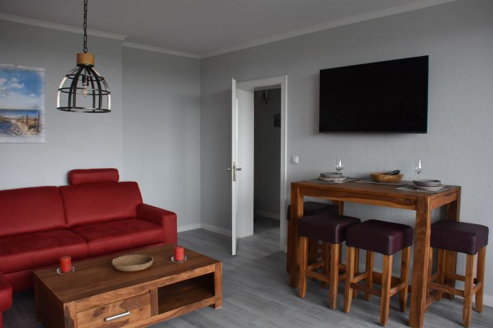Das geräumige Wohnzimmer ist hell durch das große Balkonelement. Zur Ausstattung gehören ein Ecksofa mit Schlaffunktion, sowie ein Flachbild-TV und ein erhöhter Esstisch mit 4 Hocker.