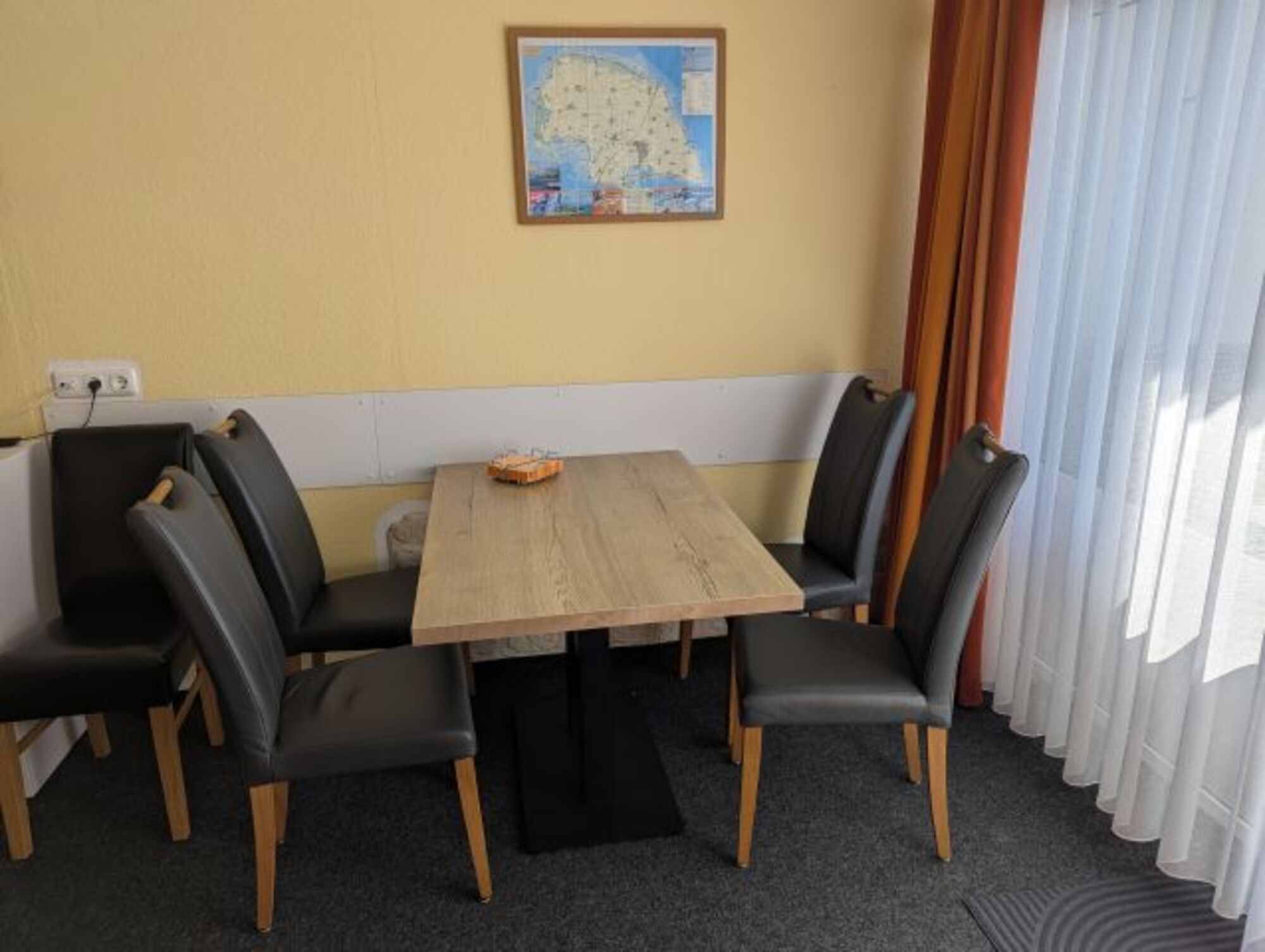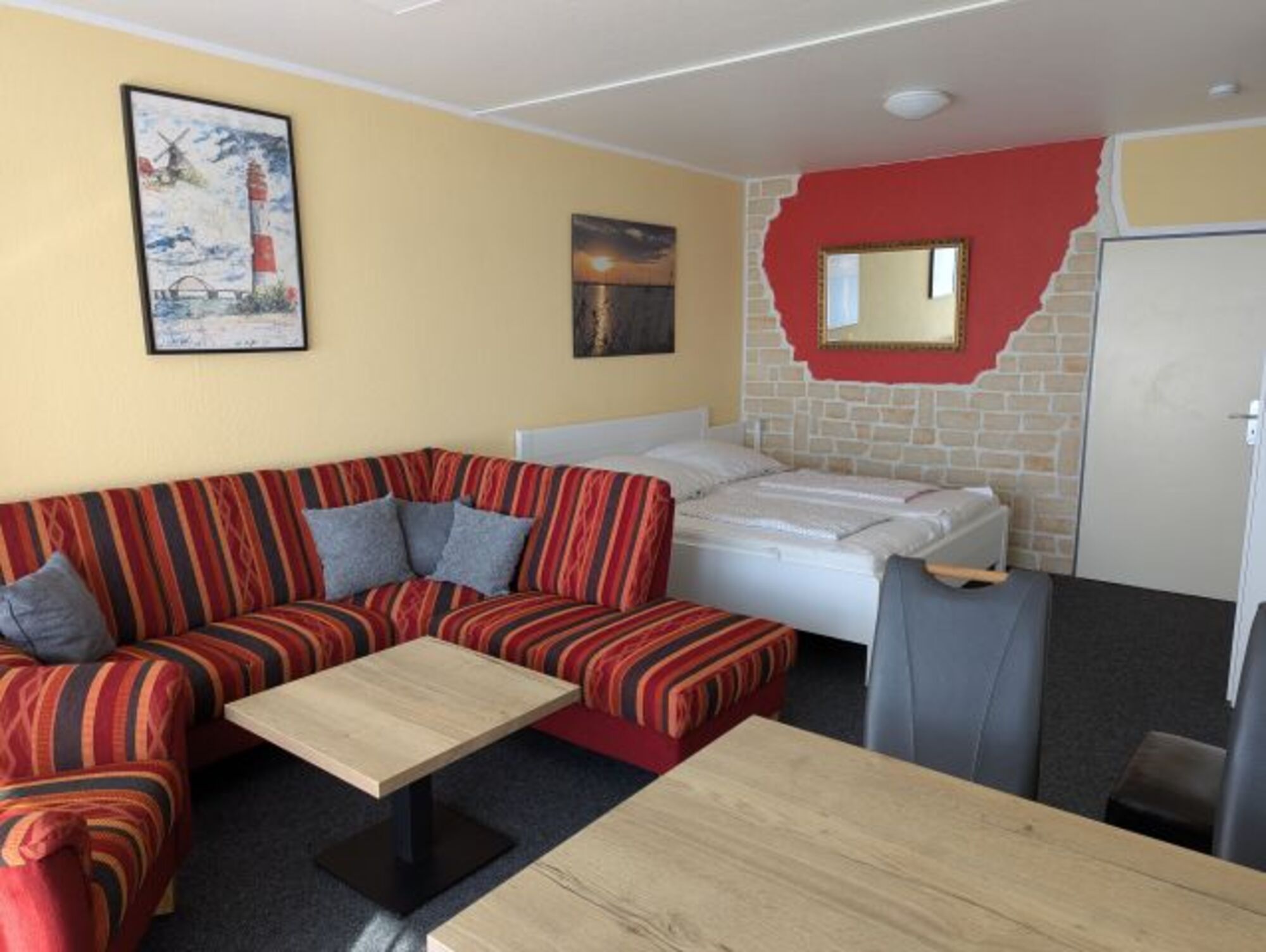 Im gemütlich gestalteten Wohn-/Schlafbereich befindet sich ein 180x200 cm großes Doppelbett mit 2 verstellbaren Lattenrosten und 2 getrennten Matratzen in der Größe 90x200 cm. Eine dreiteilige Couchgarnitur, geeignet für bis zu 6 Personen mit Couchtisch, eine Essecke mit 5 Stühlen (weitere Stühle in der Wohnung vorhanden) sowie eine Stereokompaktanlage mit Radio und CD-Spieler komplettieren die Einrichtung. Sie finden genügend Stauraum im geräumigen Kleiderschrank und haben sowohl von der Couch, wie auch vom Bett einen freien Blick auf den 39" Flat-TV mit digitalem SAT-Anschluss.