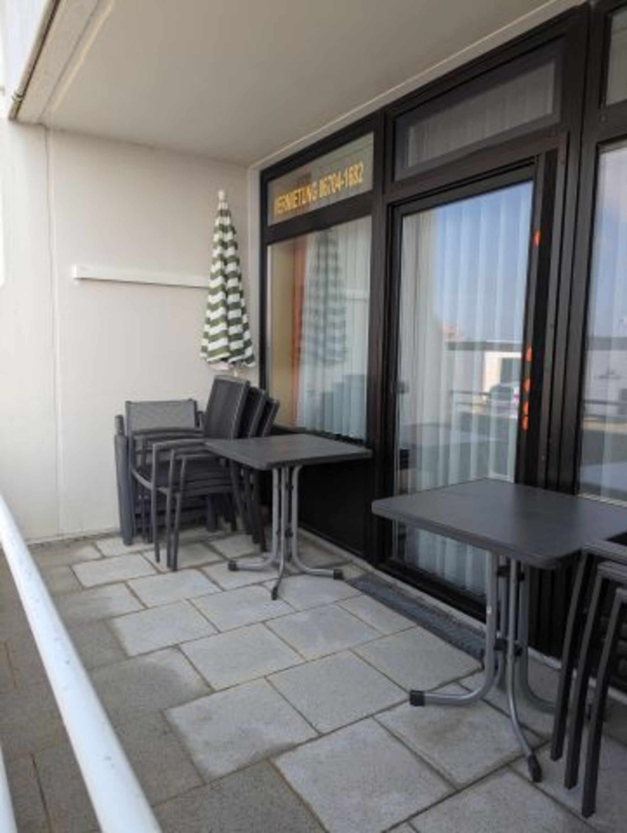 Die Terrasse, mit Tisch, Stühlen und Sonnenschirm, bietet sich bestens für ein Frühstück im Freien an und lädt zum gemütlichen Verweilen an frischer Ostsee-Luft ein.