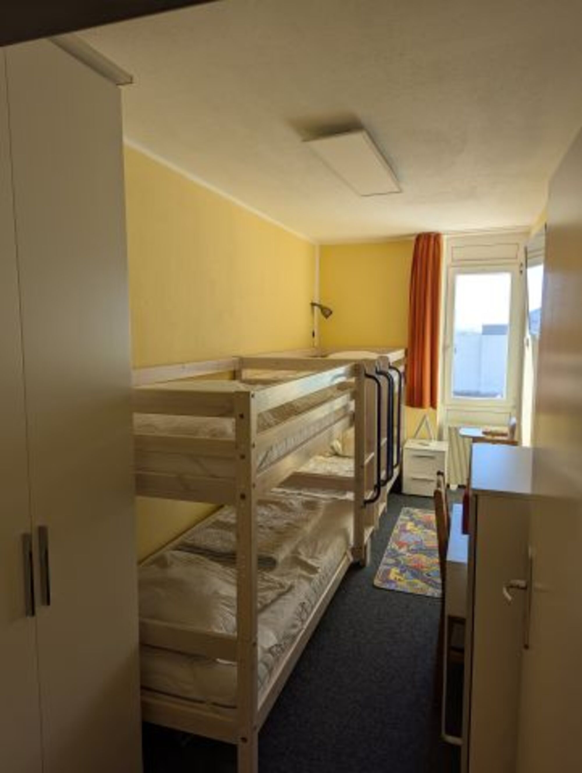 Das zweite Zimmer ist ein Schlaf-/Kinderzimmer mit zwei Etagenbetten und Kleiderschrank und FlatTV. Die oberen Betten sind bis zu 80 kg belastbar. Dieses Zimmer ist insbesondere zu Belegung mit bis zu 4 Kindern/Jugendlichen geeignet. Das Fenster dieses zweiten Zimmers ist mit einem fest eingebauten Fliegengitter, sowie einem Verdunklungsrollo versehen und für die Kleinen stehen Sandspielzeug und Kinderspiele bereit. Kinderreisebett und Kinderhochstuhl stehen kostenlos zur Verfügung.