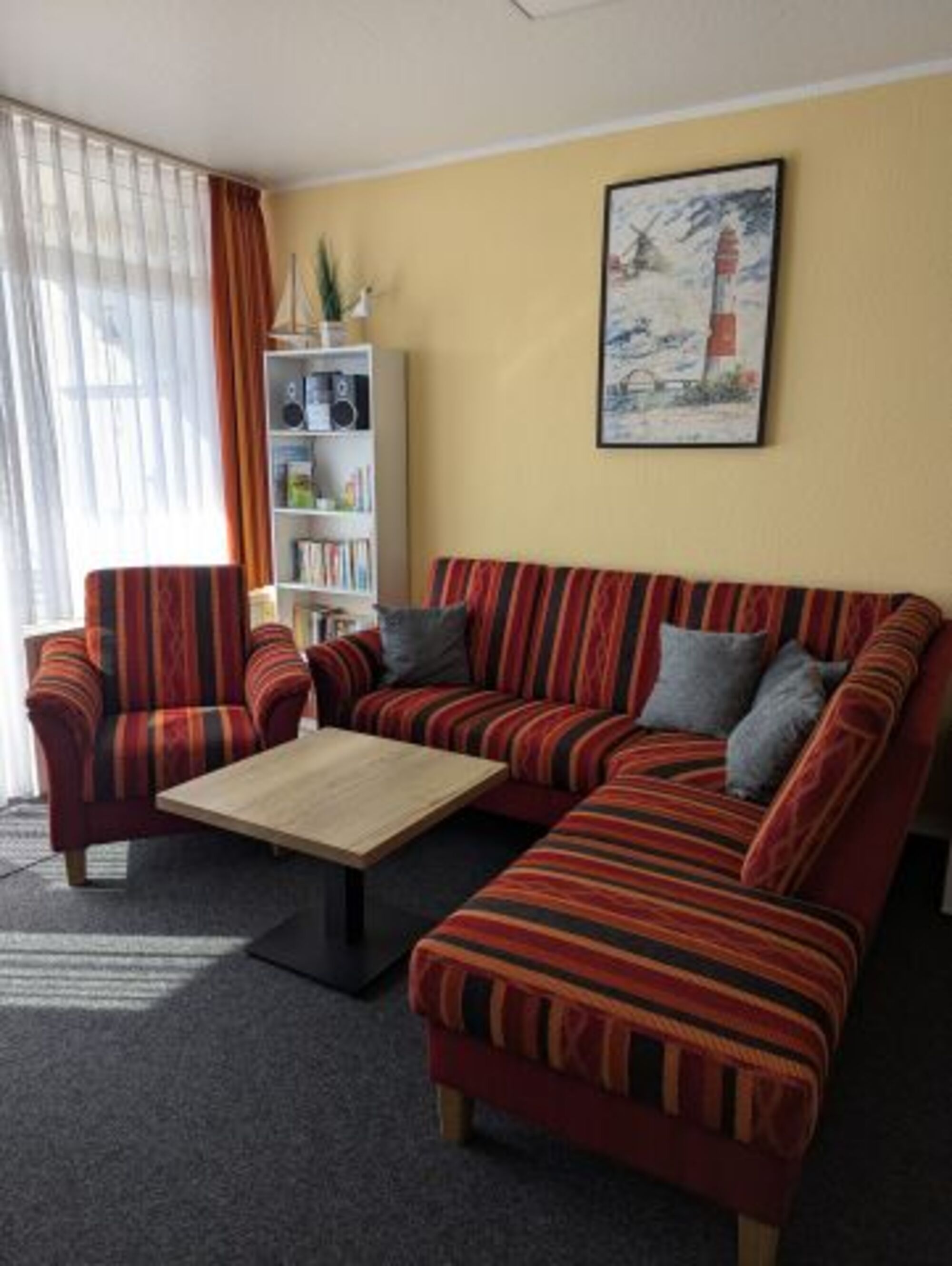 Die komfortable, überwiegend mit Kiefernmöbeln ausgestattete 2-Zimmer-Ferienwohnung ist ca. 49 qm² groß und befindet sich im Erdgeschoss eines 3- geschossigen Hauses.